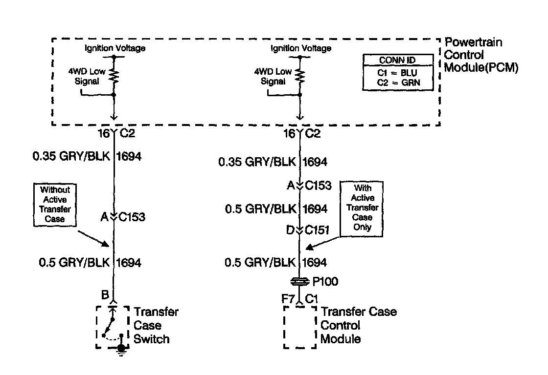 For vehicles not equipped with an active transfer case, the 4WD low circuit consists of the PCM, a transfer case switch and the circuit wiring. The transfer case switch controls the 4WD low signal on the signal circuit. When the operator selects 4WD low, the transfer case switch closes and the 4WD low signal voltage on the signal circuit changes from ignition voltage to zero volts. The PCM then compensates for transfer case gear reduction in the transmission output shaft speed (OSS) sensor signal. The PCM uses the transmission OSS sensor signal to adjust Shift points, line pressure and TCC scheduling.