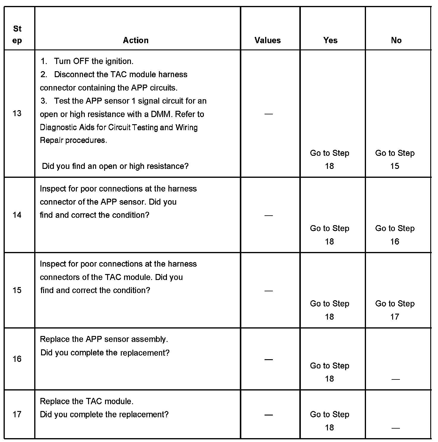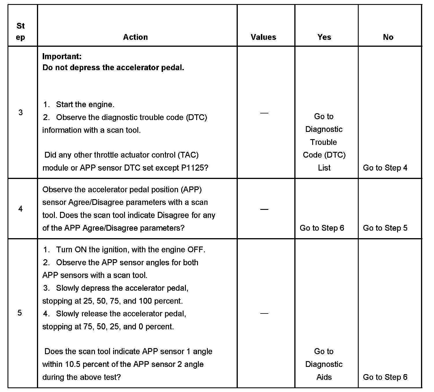 5. This step isolates an internal APP sensor failure. The condition may only occur at a certain accelerator pedal position. Monitoring the APP angles for sensor 2 and sensor 3 is an accurate way of verifying the actual position of the pedal. The APP angles for all 3 sensors should be within a few percent of each other. If the pedal is at rest, the APP angle for all 3 sensors should be 0 percent. If the pedal is fully depressed, all APP angles should be 100 percent.
