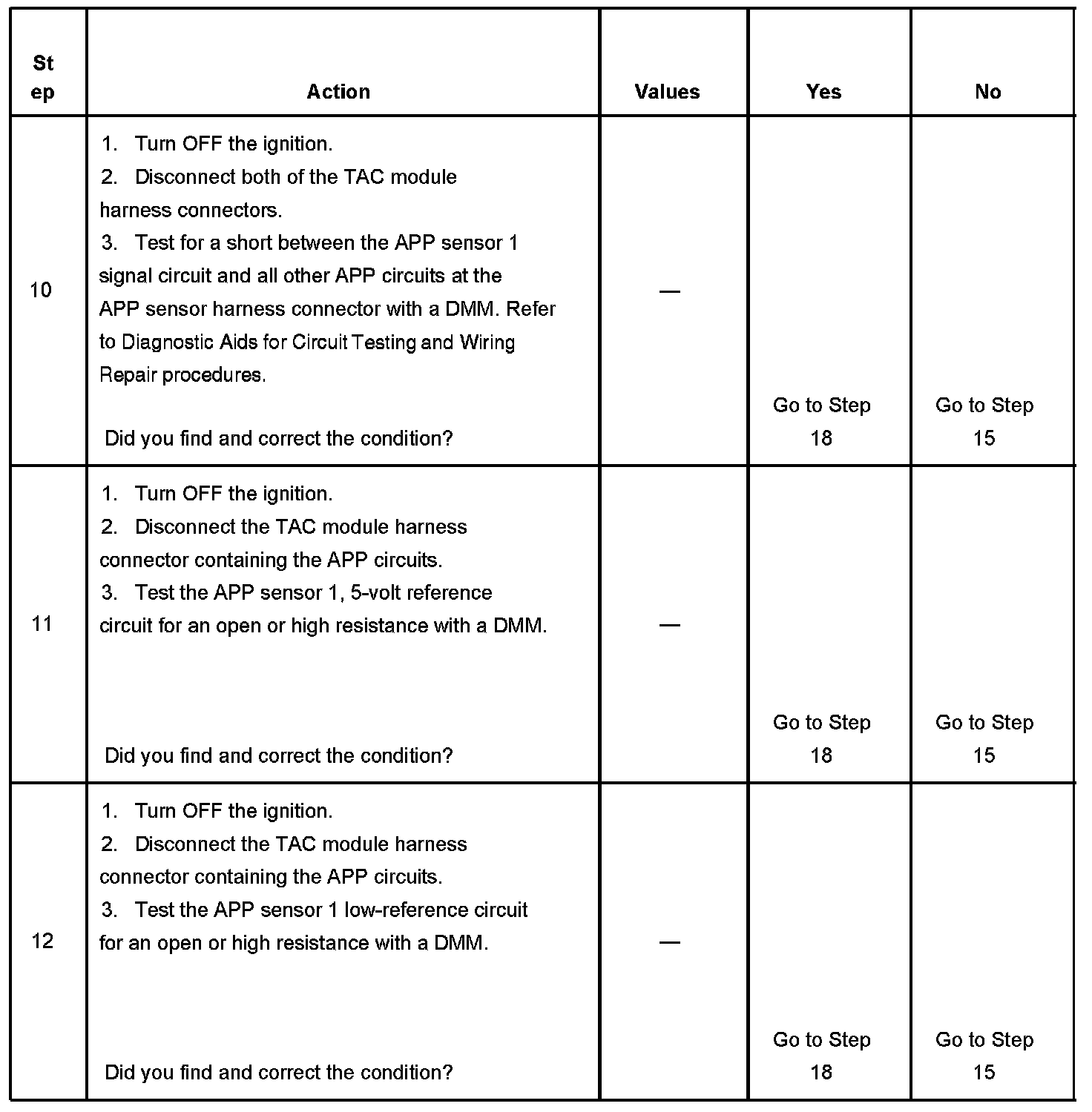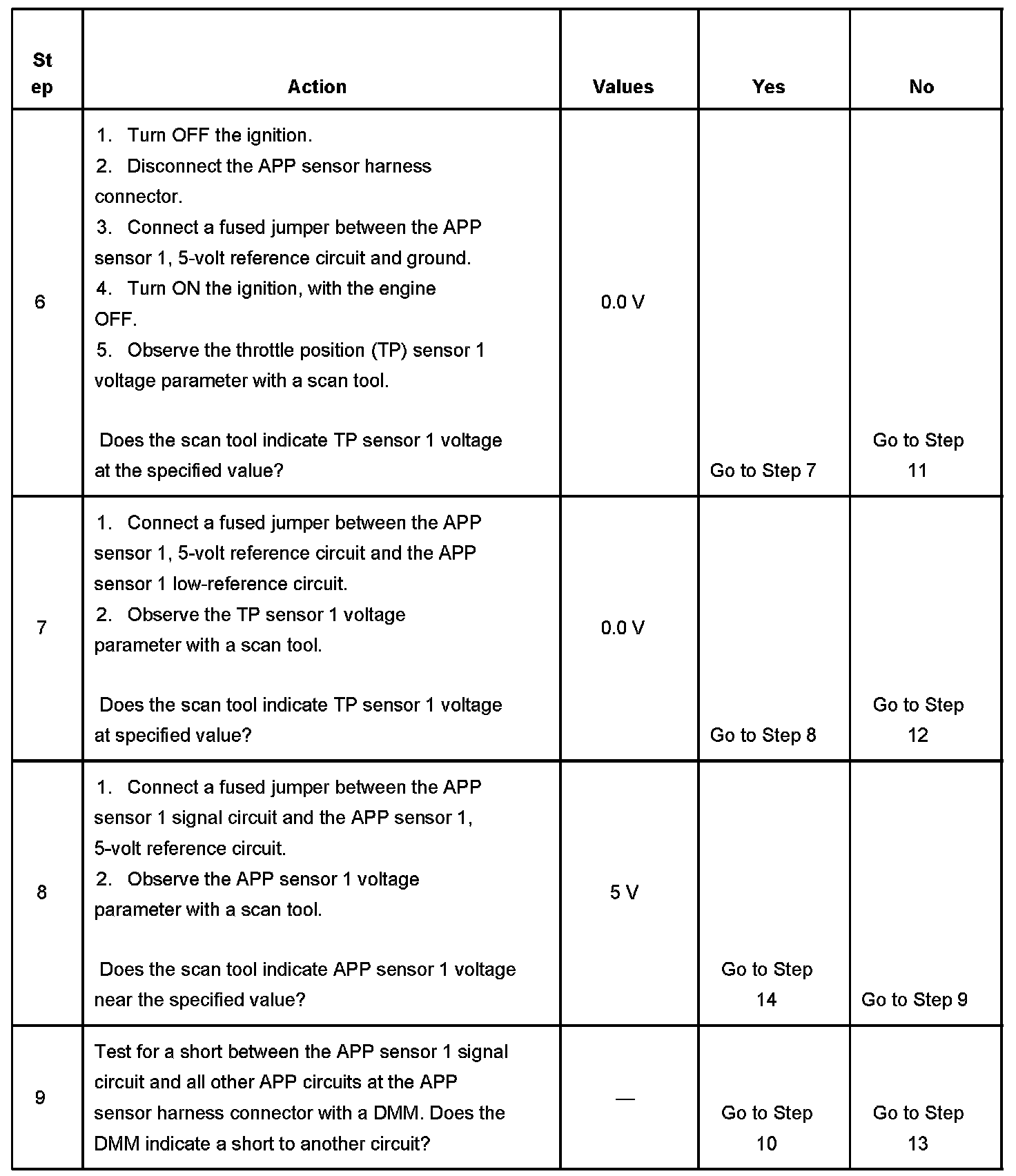 6. The APP sensor 1 shares a common 5-volt reference circuit with the throttle position (TP) sensor 1. Monitoring the TP sensor 1 voltage aids in diagnosing the APP sensor 5-volt reference and low-reference circuits. If the scan tool displays near 0 volts, the circuits are OK.