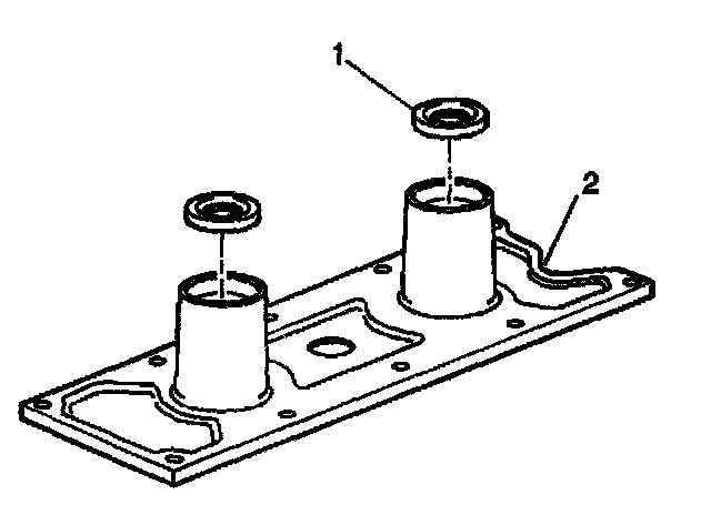 2. Install the knock sensor oil seals (1) into the engine valley cover (2).