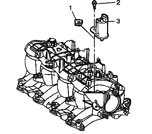 8. Install the Evaporative Emission (EVAP) purge solenoid (3), bolt (2), and isolator (1).