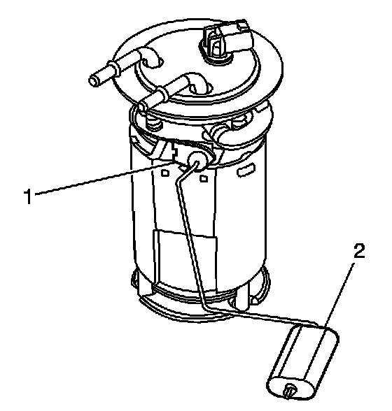 The fuel level sensor consists of a float (2), a wire float arm, and a ceramic resistor cord. The position of the float arm indicates the fuel level. The fuel level sensor contains a variable resistor (1), which changes resistance in correspondence to the amount of fuel in the fuel tank. The powertrain control module (PCM) sends the fuel level information via the class 2 circuit to the instrument panel (I/P) cluster. This information is used for the I/P fuel gage and the low fuel warning indicator, if applicable. The PCM also monitors the fuel level input for various diagnostics.