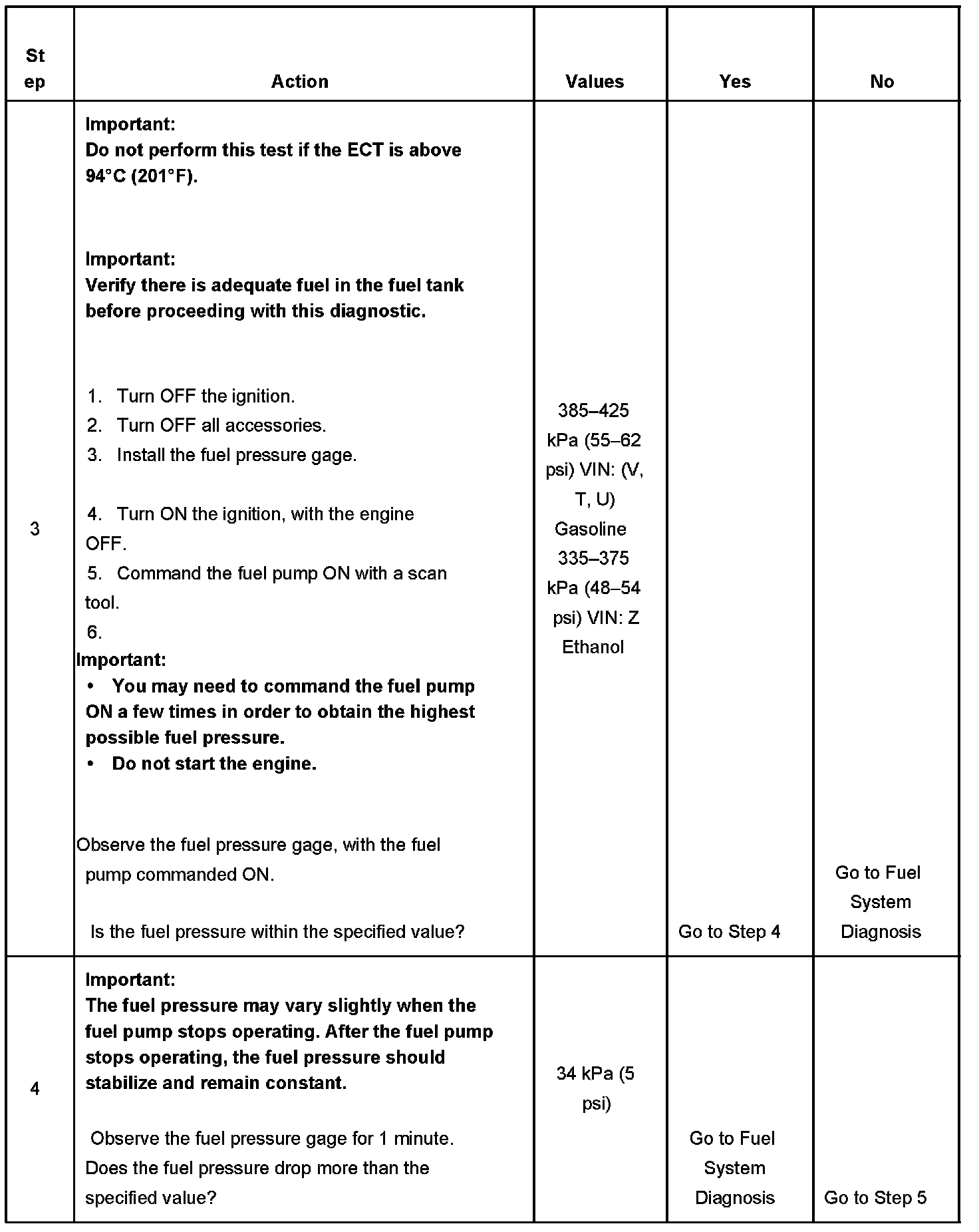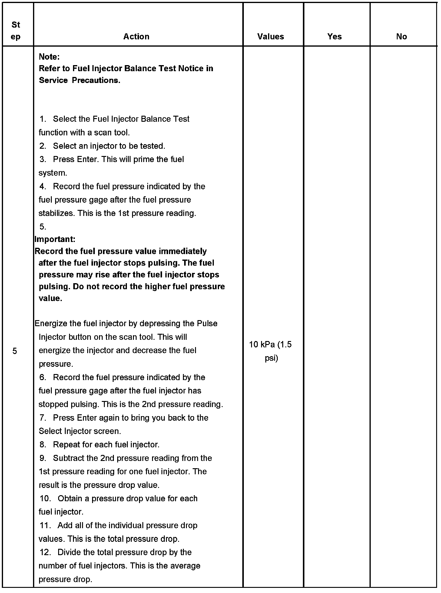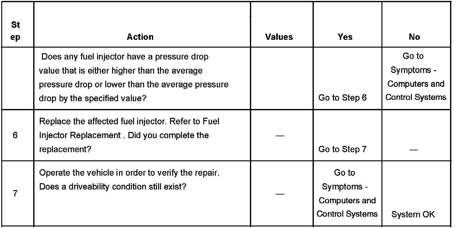 5. If the pressure drop value for each fuel injector is within 10 kPa (1.5 psi) of the average pressure drop value, the fuel injectors are flowing properly. Calculate the pressure drop value for each fuel injector by subtracting the second pressure reading from the first pressure reading.