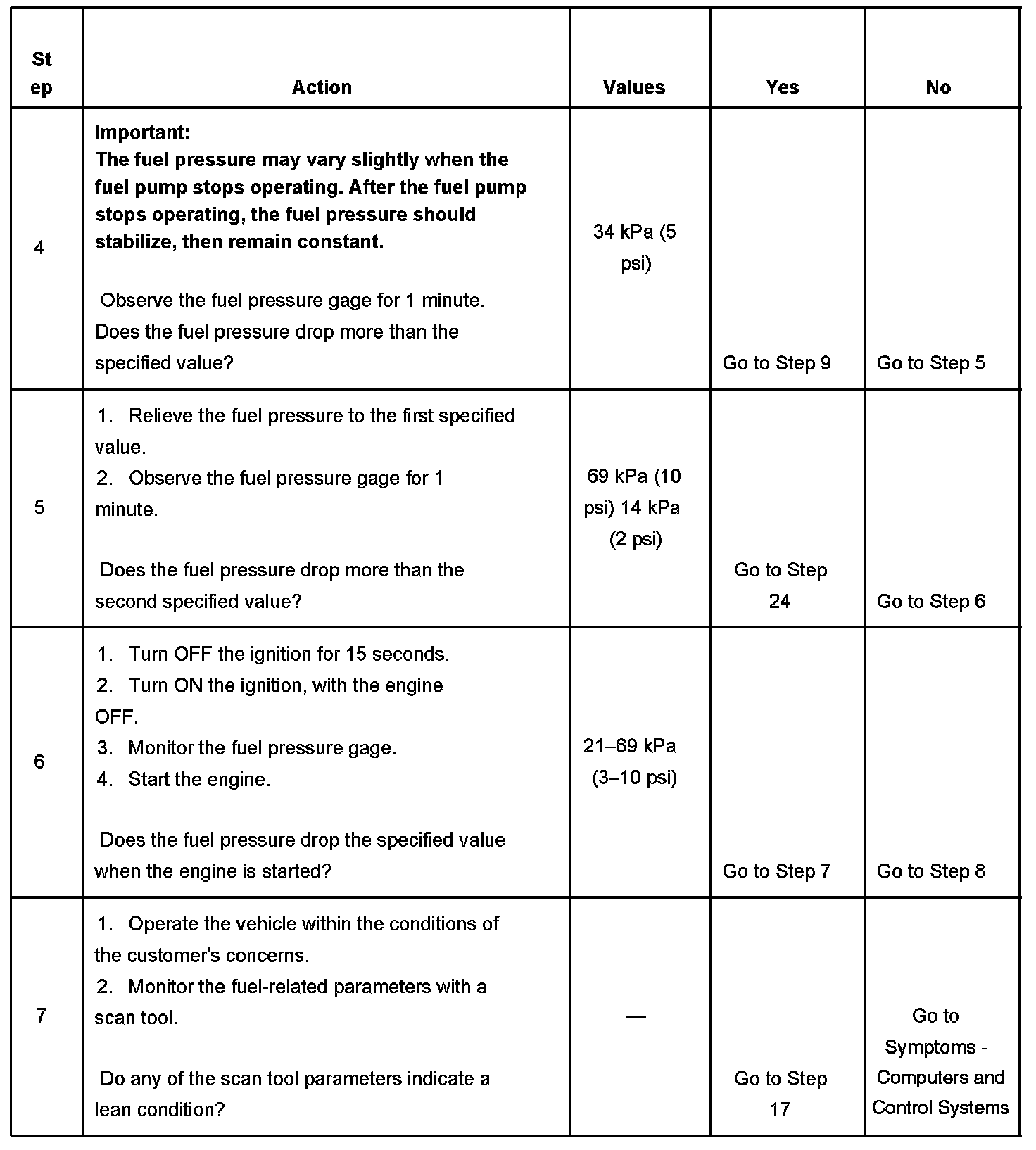 5. This step tests the fuel pump check valve for a leak down condition.