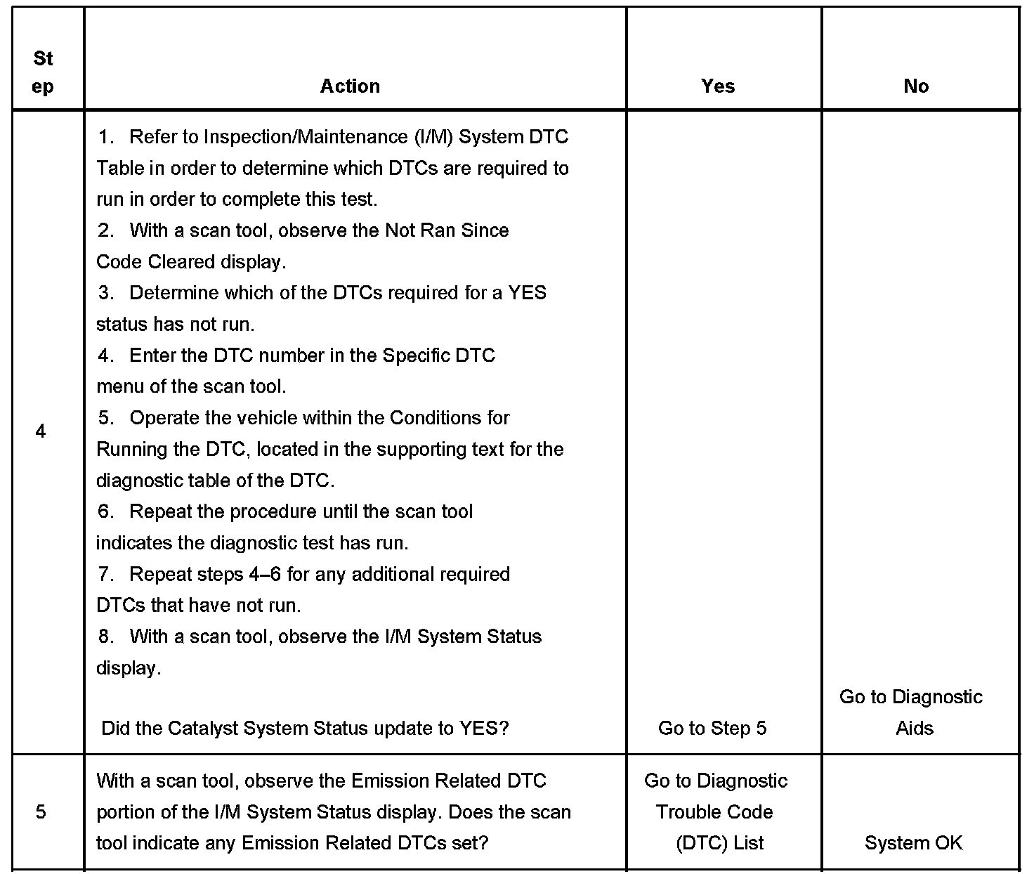 3. This step is to identify a first failure of a type B DTC. A DTC only appears on the I/M System Status display when the DTC becomes a MIL illuminating DTC. This occurs during the second failure of a type B DTC. A first failure of a type B DTC will not allow the I/M System Status to update to YES. Refer to diagnostic aids.