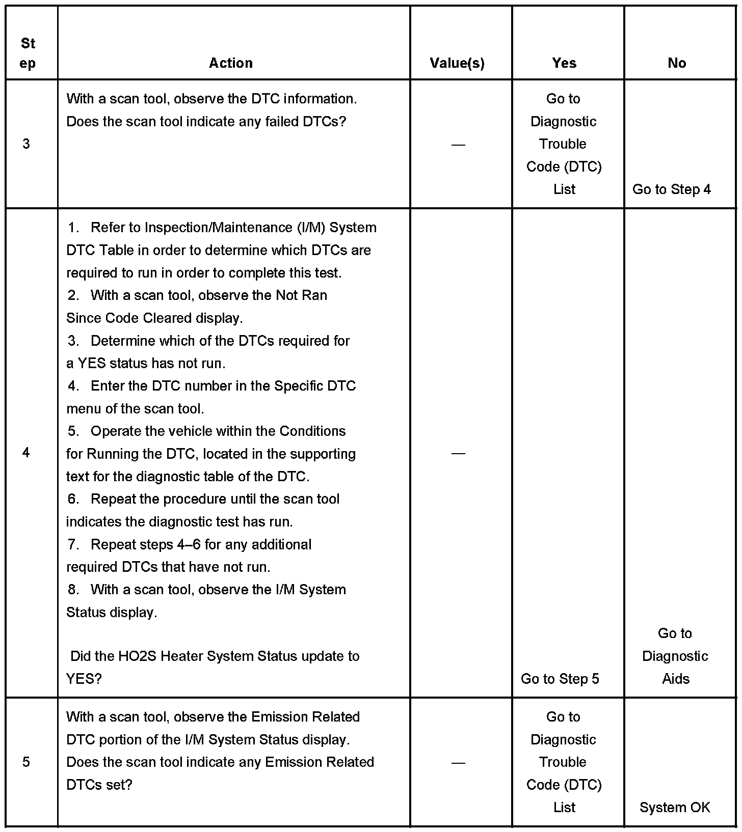 3. This step is to identify a first failure of a type B DTC. A DTC only appears on the I/M System Status display when the DTC becomes a MIL-illuminating DTC. This occurs on the second failure of a type B DTC. A first failure of a type B DTC will not allow the I/M System Status to update to YES. Refer to diagnostic aids.