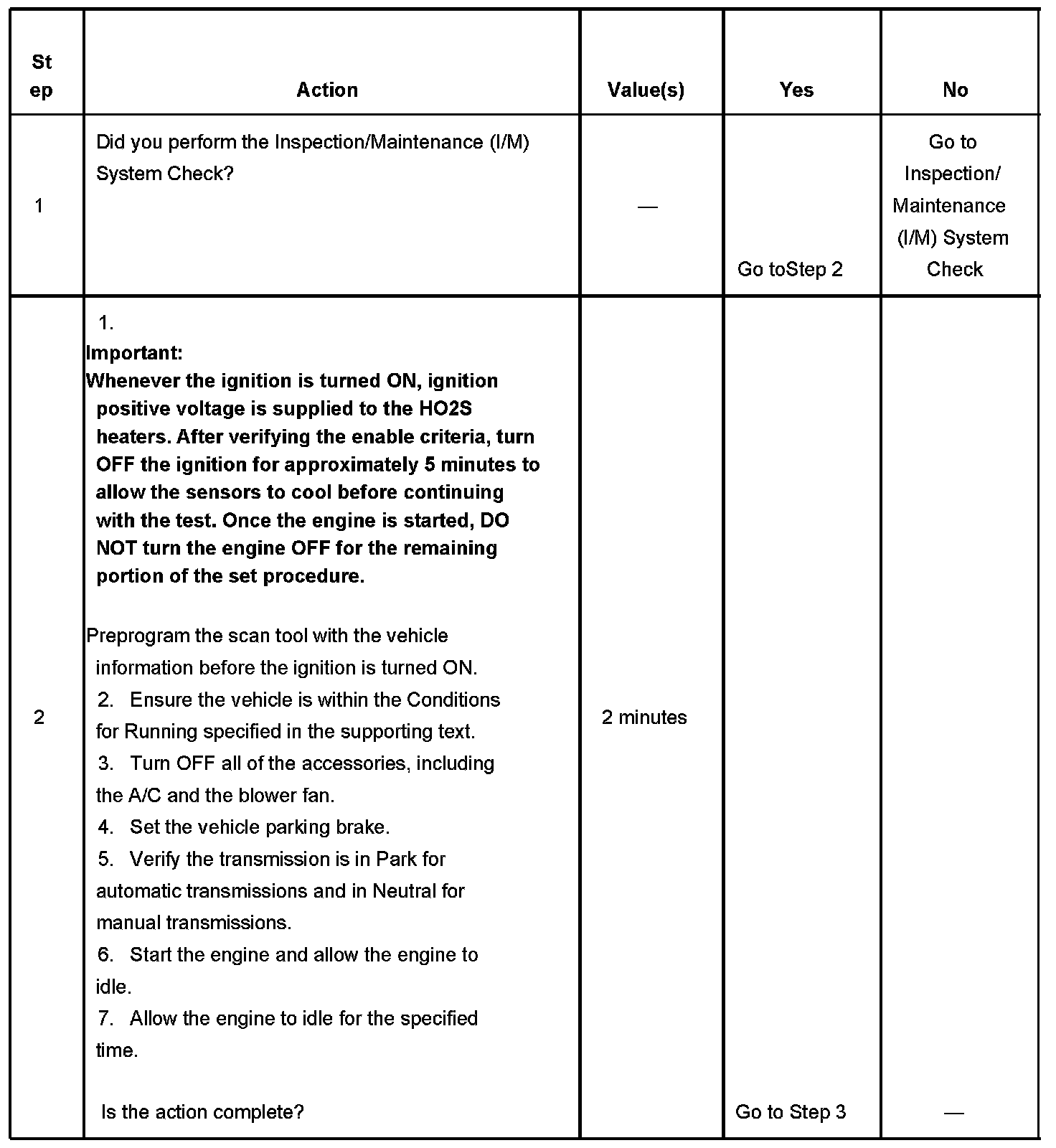 1. Perform the I/M System Check before performing this test. Inspection/Maintenance (I/M) System Check Failure to do so may result in difficulty updating the status to YES.