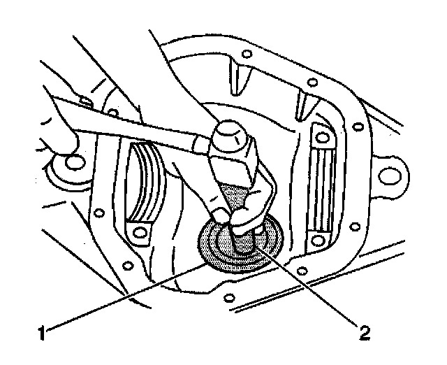 1. Install the outer pinion bearing cup using the J7817, 8.0 inch axle, or the J8611-01, 8.6 inch axle (1), and the J8092 (2).