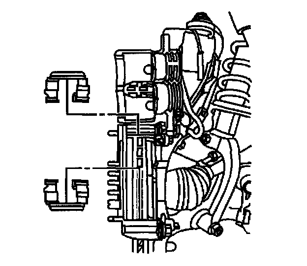 Notice: Support the brake caliper with heavy mechanic's wire, or equivalent, whenever it is separated from it's mount and the hydraulic flexible brake hose is still connected. Failure to support the caliper in this manner will cause the flexible brake hose to bear the weight of the caliper, which may cause damage to the brake hose and in turn may cause a brake fluid leak.