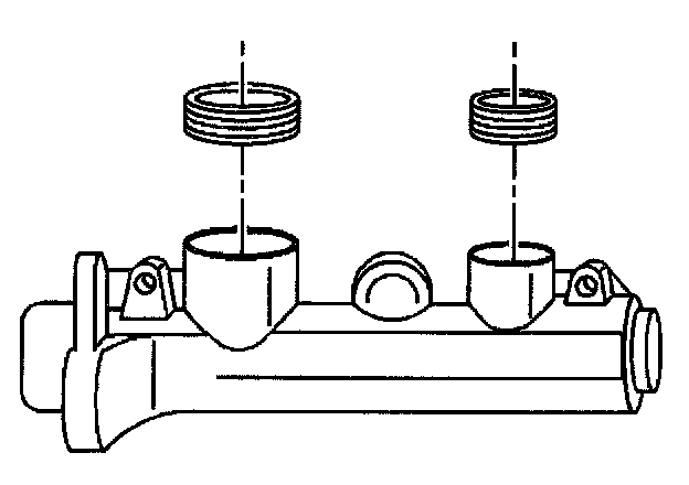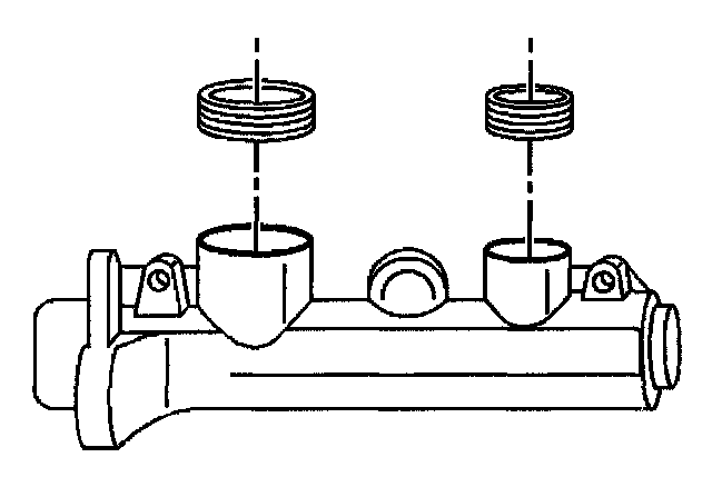 1. Lubricate the new seals and the outer surface area of the reservoir-to-housing barrels with Delco Supreme II (GM P/N 12377967) or equivalent DOT-3 bake fluid from a clean, sealed brake fluid container.