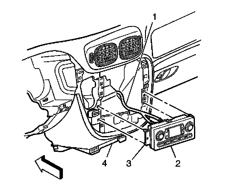 2. Install the HVAC control module (2) to the instrument panel (4), ensuring that the HVAC control module retaining tabs (3) lock into place.
