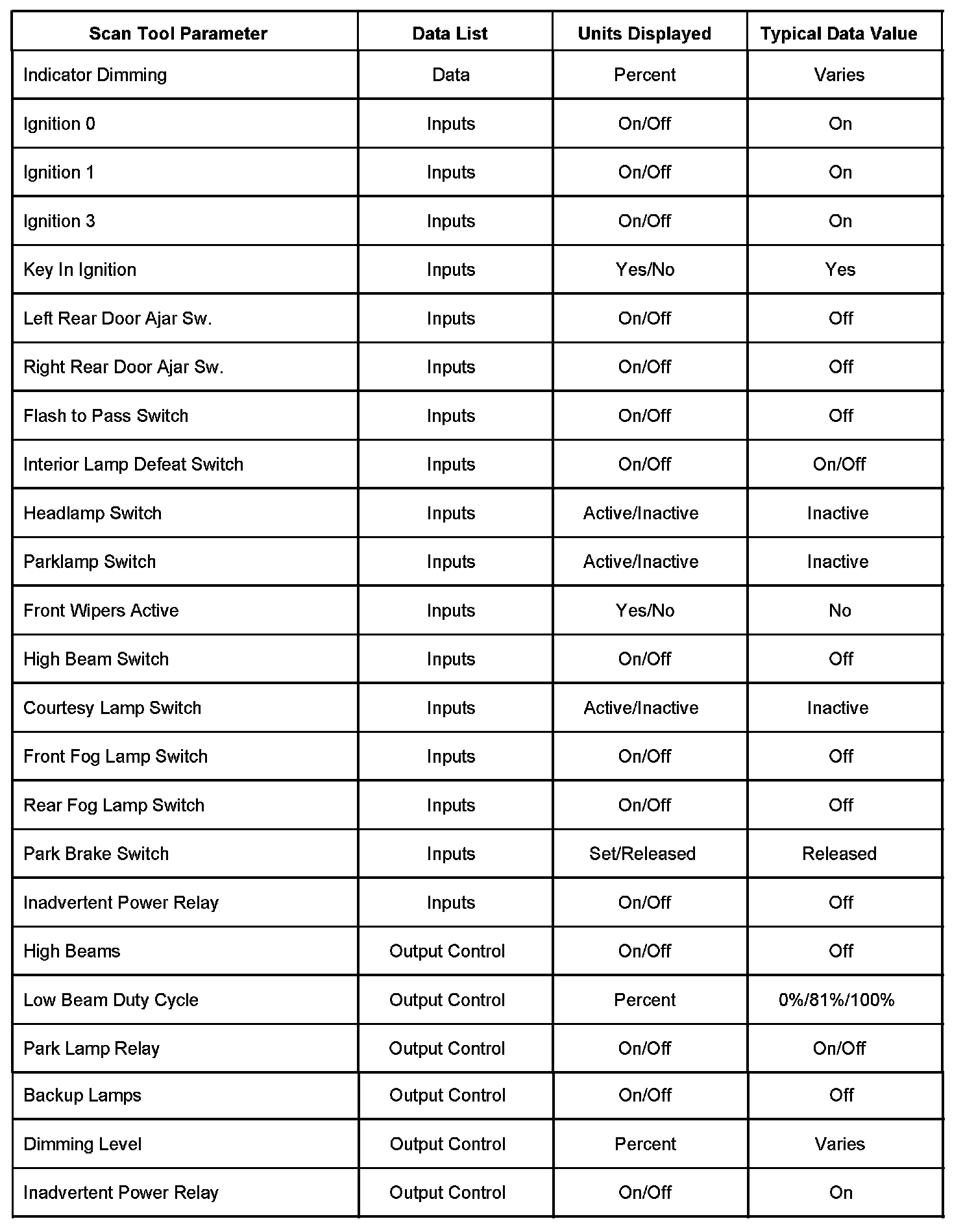 Scan Tool Data List - Body Control Module (BCM)