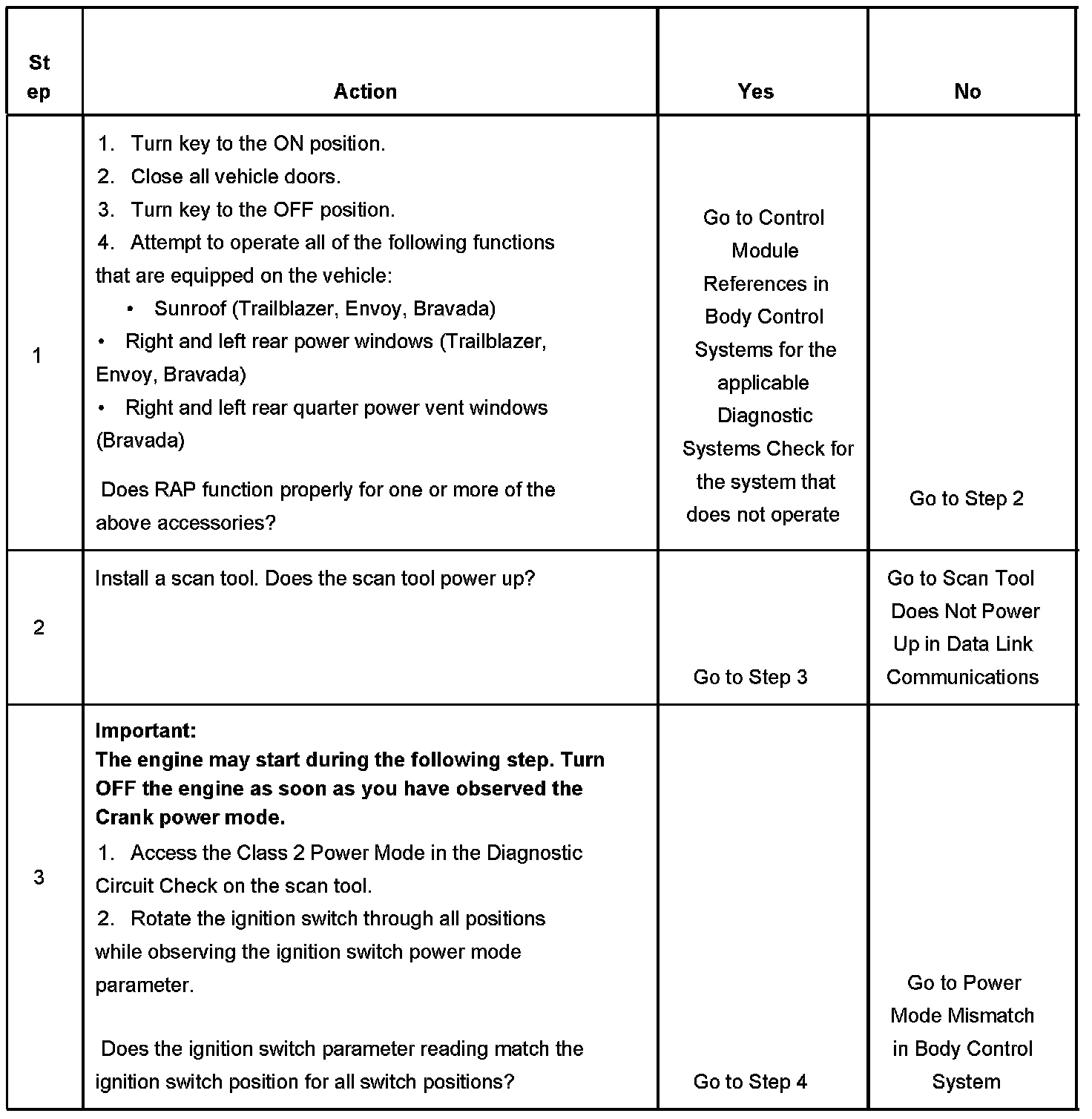1. This step verifies that the RAP power mode function is malfunctioning by checking functions internally enabled by the BCM.