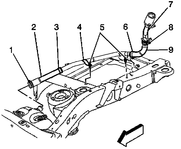 9. Install the new fuel fill upper pipe into the vehicle. Use P/N 88983256 for 2002-2003 model year vehicles or P/N 15131043 for 2004 model year vehicles.