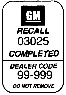 Put the Recall Identification Label on a clean and dry surface of the radiator core support in an area that will be visible to people servicing the vehicle. Additional Recall Identification Labels for Canadian dealers can be obtained from DGN. Ask for Item Number GMP 91 when ordering.
