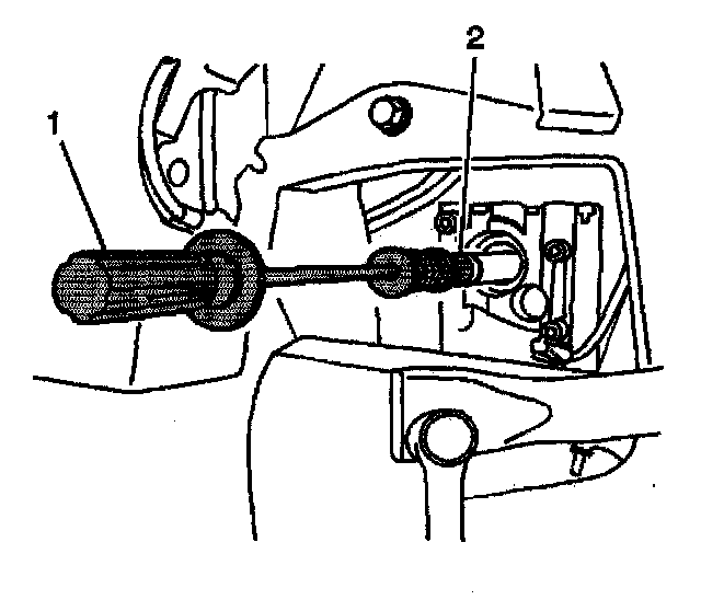 6. Remove the inner axle shaft using the J6125-B (1) and the J45104 (2).