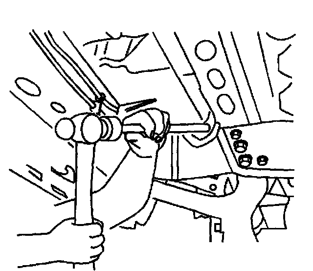 15. Disconnect the left side wheel drive shaft from the differential carrier assembly by placing a brass drift against the tripot housing. Firmly strike the brass drift outward from the case with a hammer. Strike hard enough to overcome the snap ring pressure holding in the shaft.