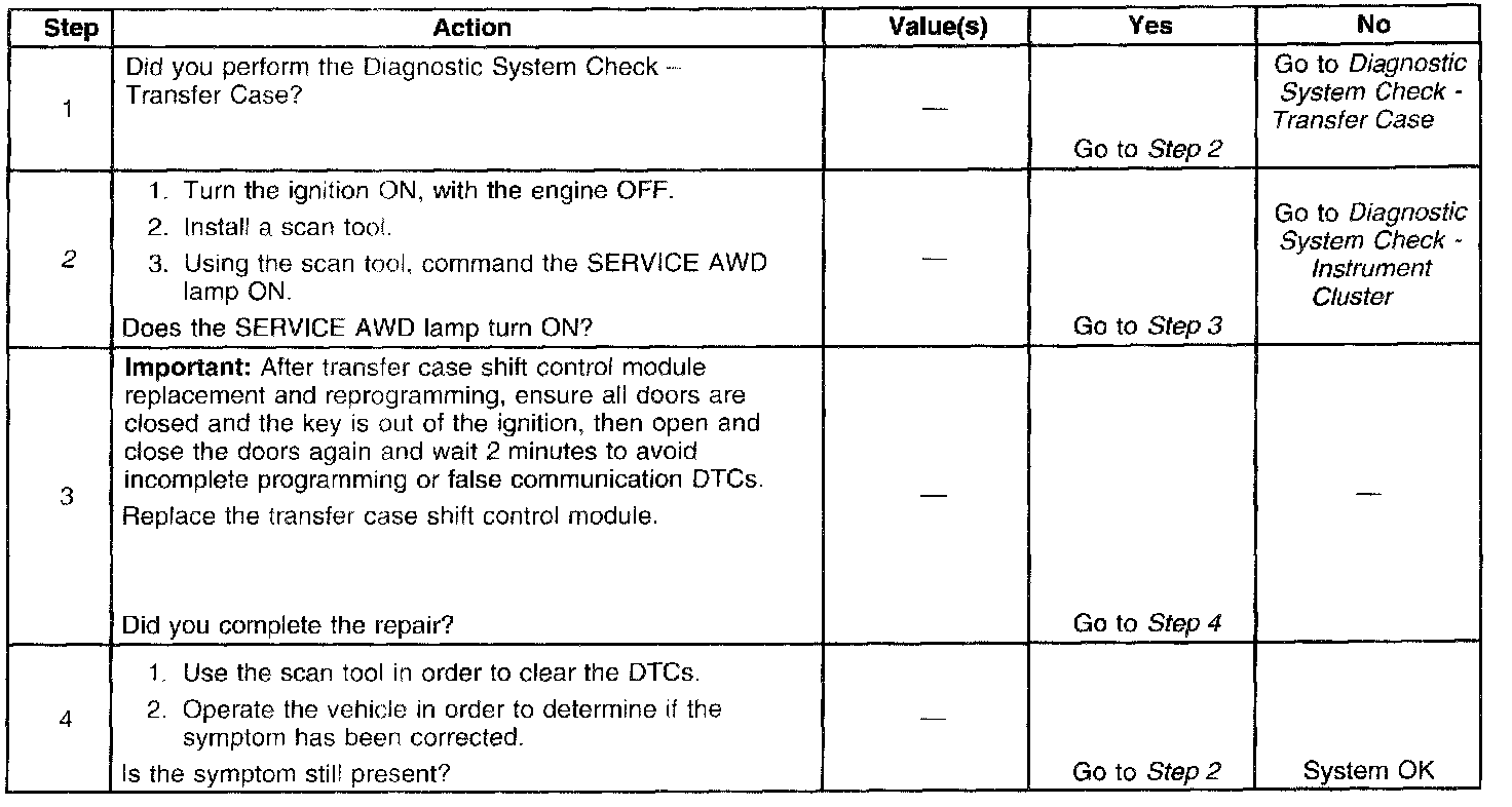 The SERVICE AWD indicator is located in the instrument cluster. It shares the instrument cluster common power and ground. The transfer case shift control module controls the SERVICE AWD indicator by sending the instrument cluster a Class 2 message. This lamp may be controlled with the scan tool using the instrument cluster device controls.