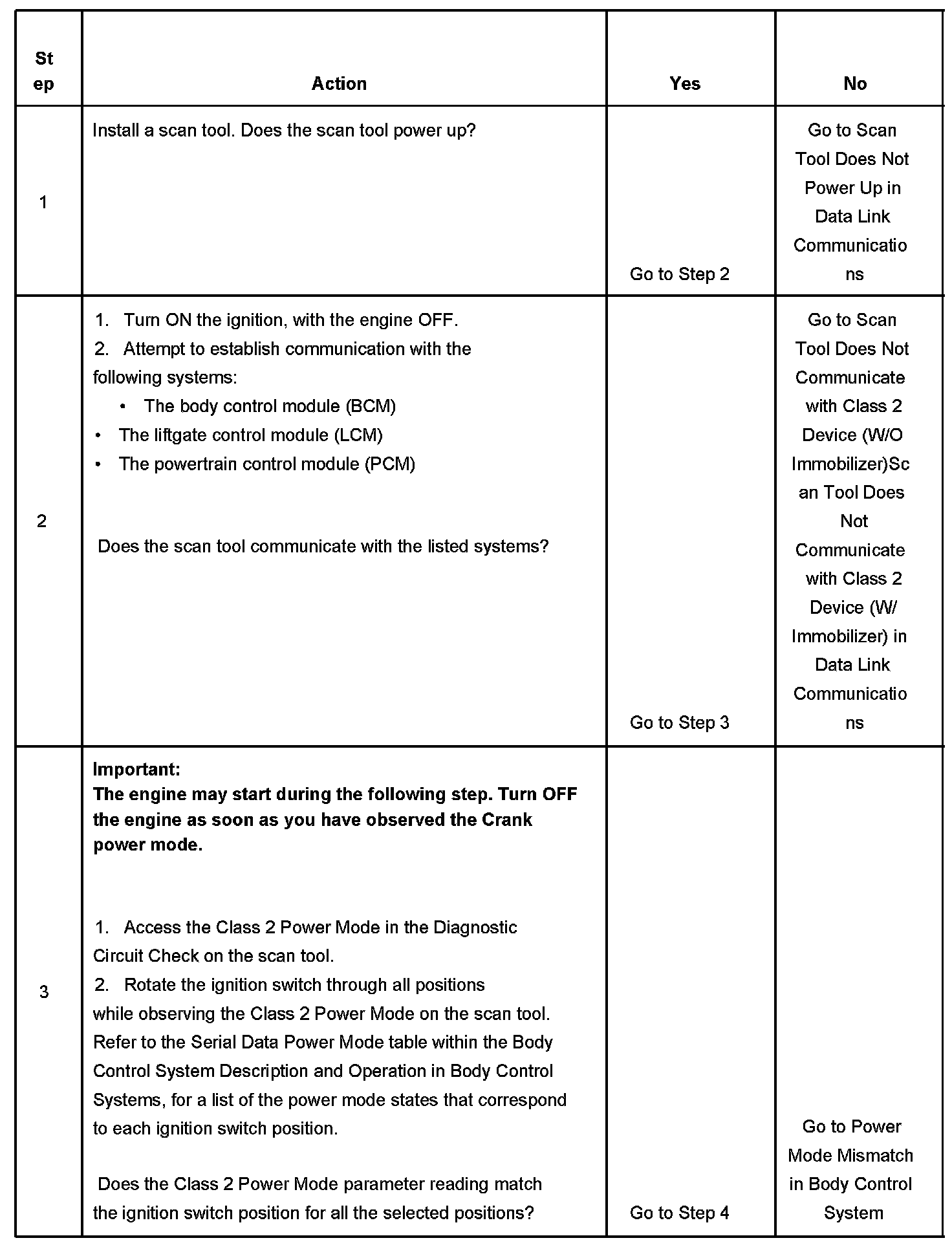 2. Lack of communication may be due to a partial malfunction of the class 2 serial data circuit or due to a total malfunction of the class 2 serial data circuit. The specified procedure will determine the particular condition.