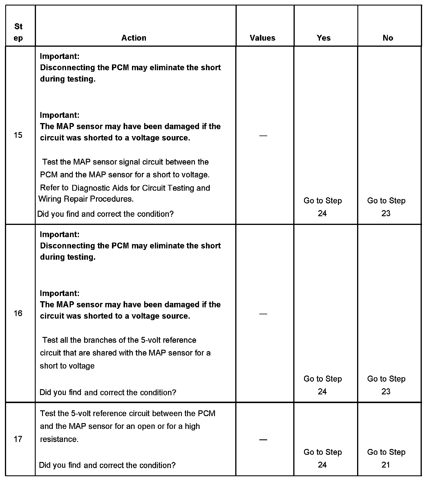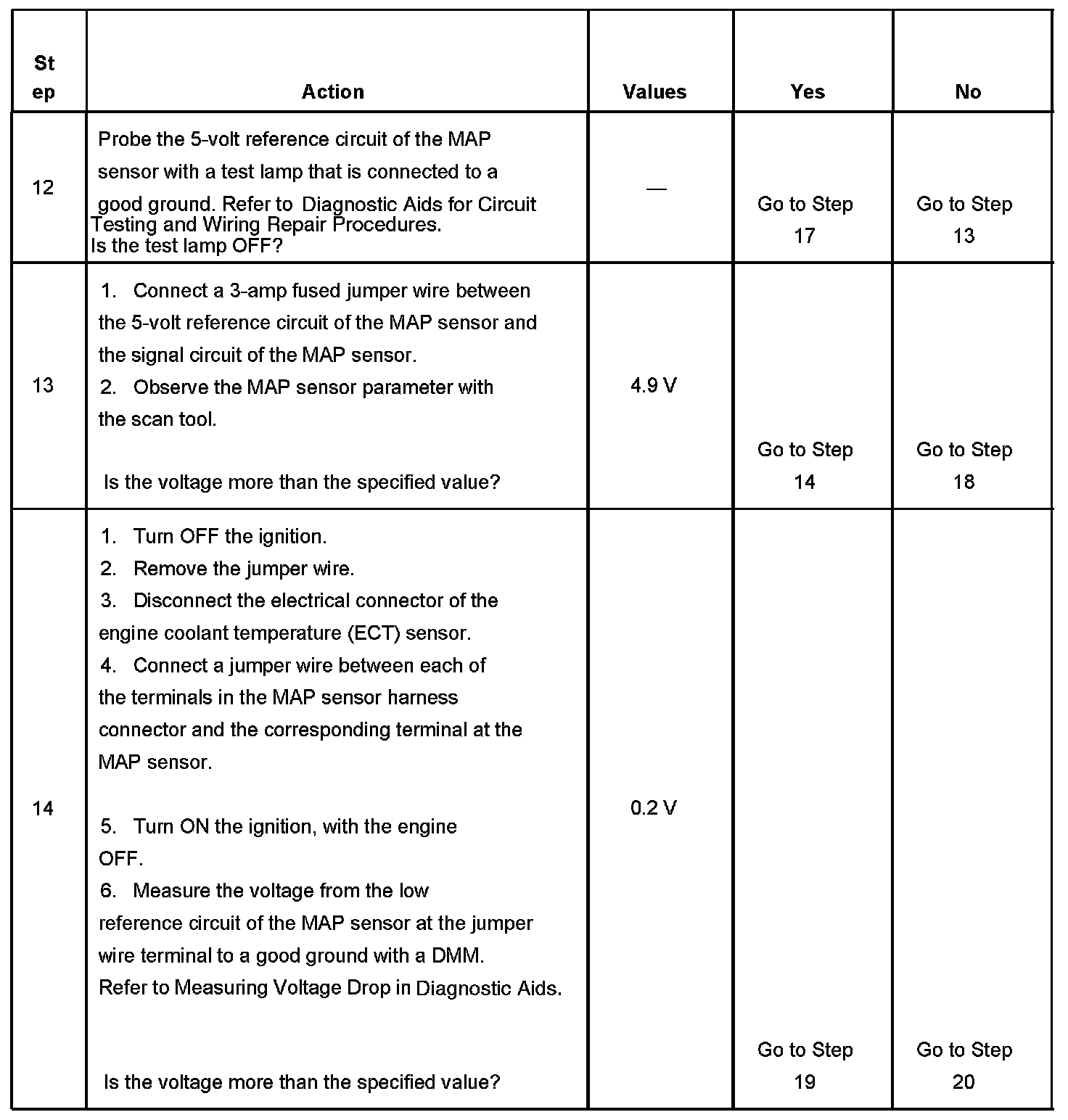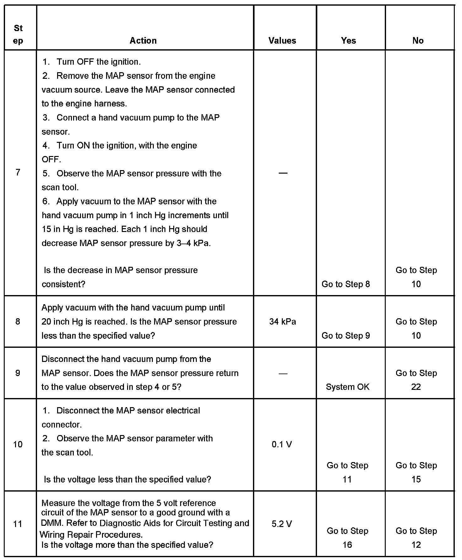 If the PCM detects a MAP sensor signal voltage that is excessively high, DTC P0108 sets. If the PCM detects a MAP sensor signal voltage that is excessively low, DTC P0107 sets