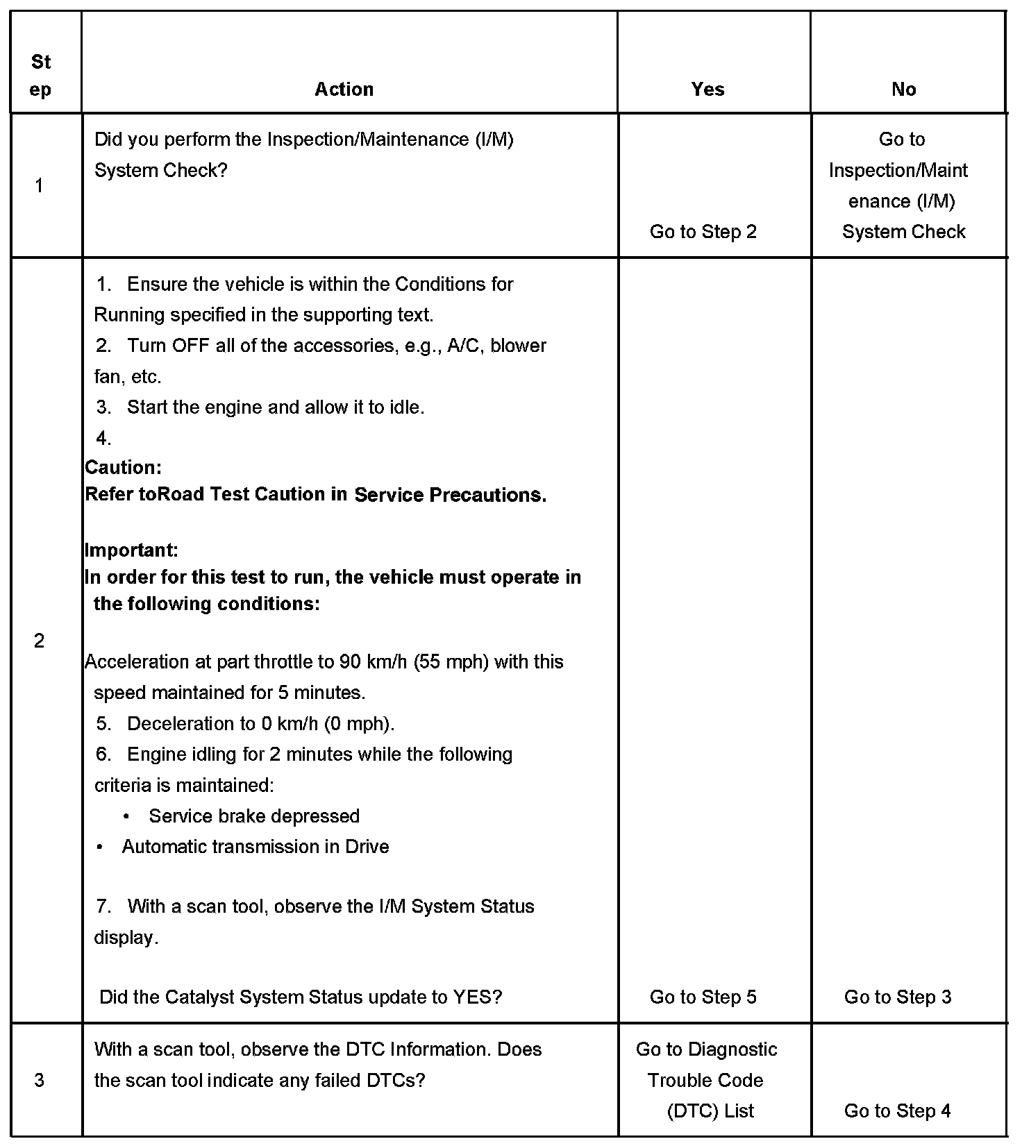 The purpose of this test is to satisfy the enable criteria necessary to execute I/M readiness diagnostics for the Catalyst System. The test may be used to set the I/M System Status indicators to YES. Ensure the vehicle meets the requirements listed in Conditions for Running before performing this test. Failure to meet the necessary requirements may produce inaccurate test results.