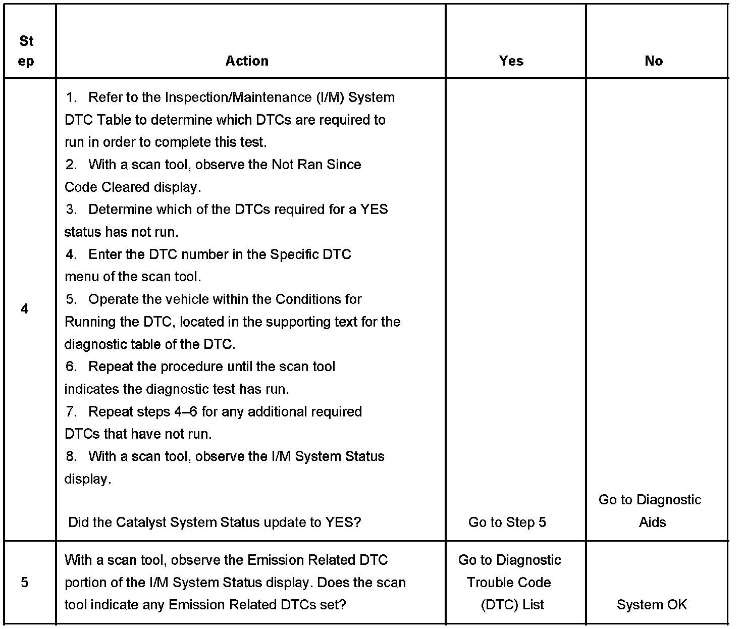 5. The I/M System Status only reports on whether or not a diagnostic has run, not what the outcome of the test was. If any Emission Related DTC sets after the tests are complete, the DTC will require diagnosis.