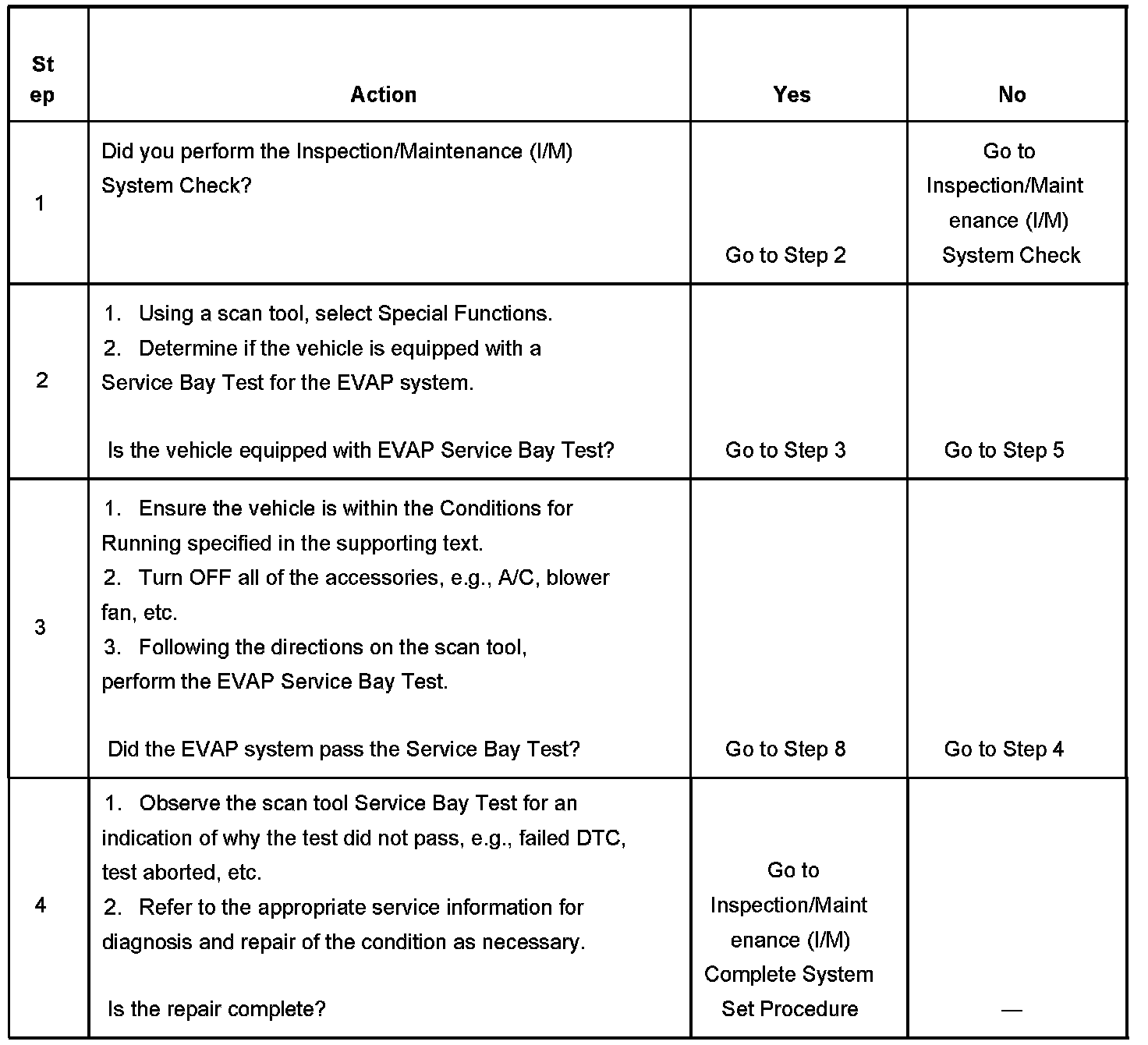 3. This step is to determine whether or not the EVAP System Test has passed. If the system is operating correctly, the scan tool indicates that the system has passed and the I/M System Status updates to YES. If the EVAP Service Bay Test aborts because of lost enable conditions, the test can be repeated once the enable criteria is met.