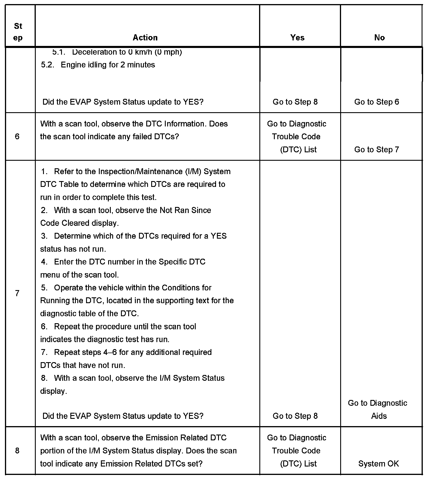 6. This step is to identify a first failure of a type B DTC. A DTC only appears on the I/M System Status display when it becomes a MIL illuminating DTC. This occurs on the second failure of a type B DTC. A first failure of a type B DTC will not allow the I/M System Status to update to YES. Refer to Diagnostic Aids.
