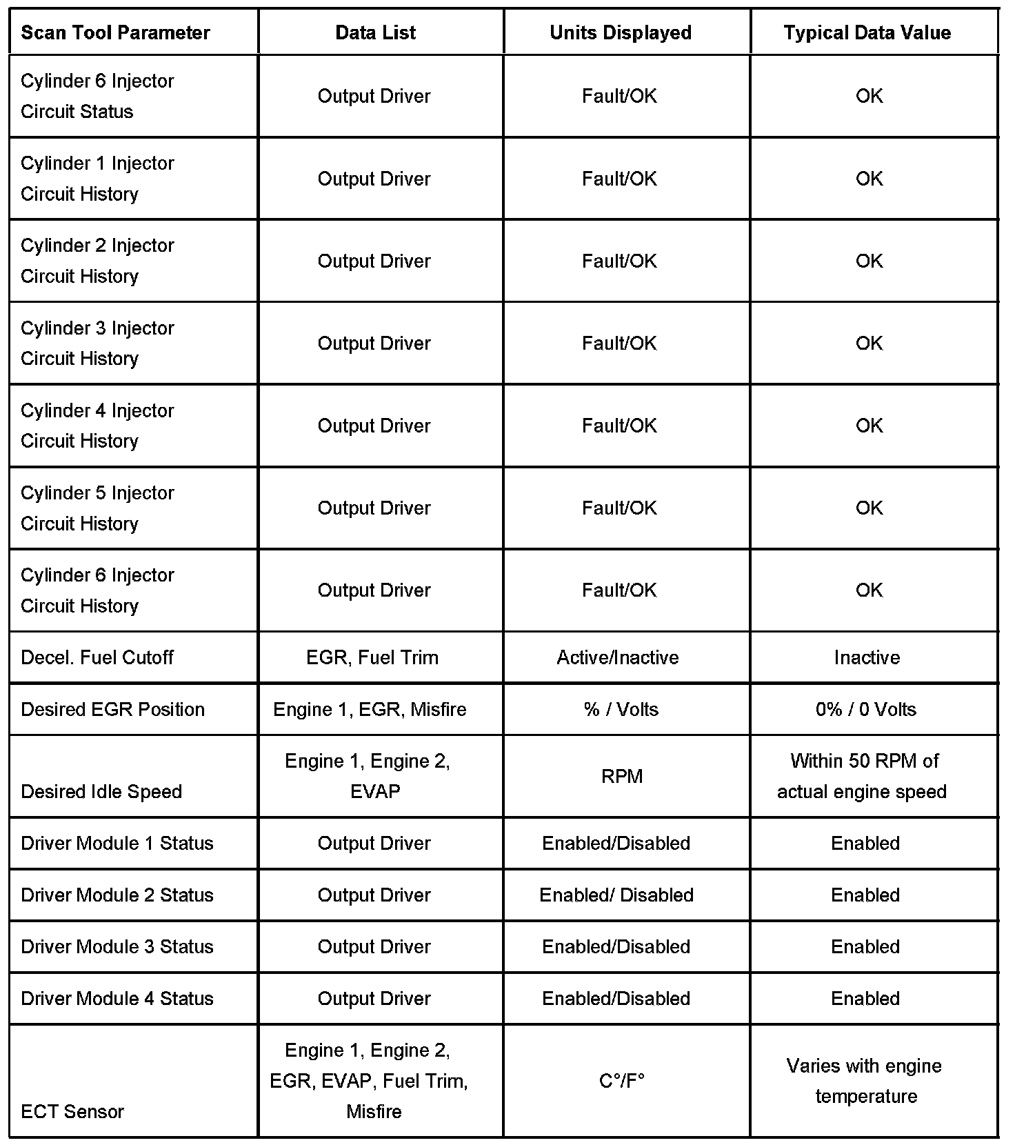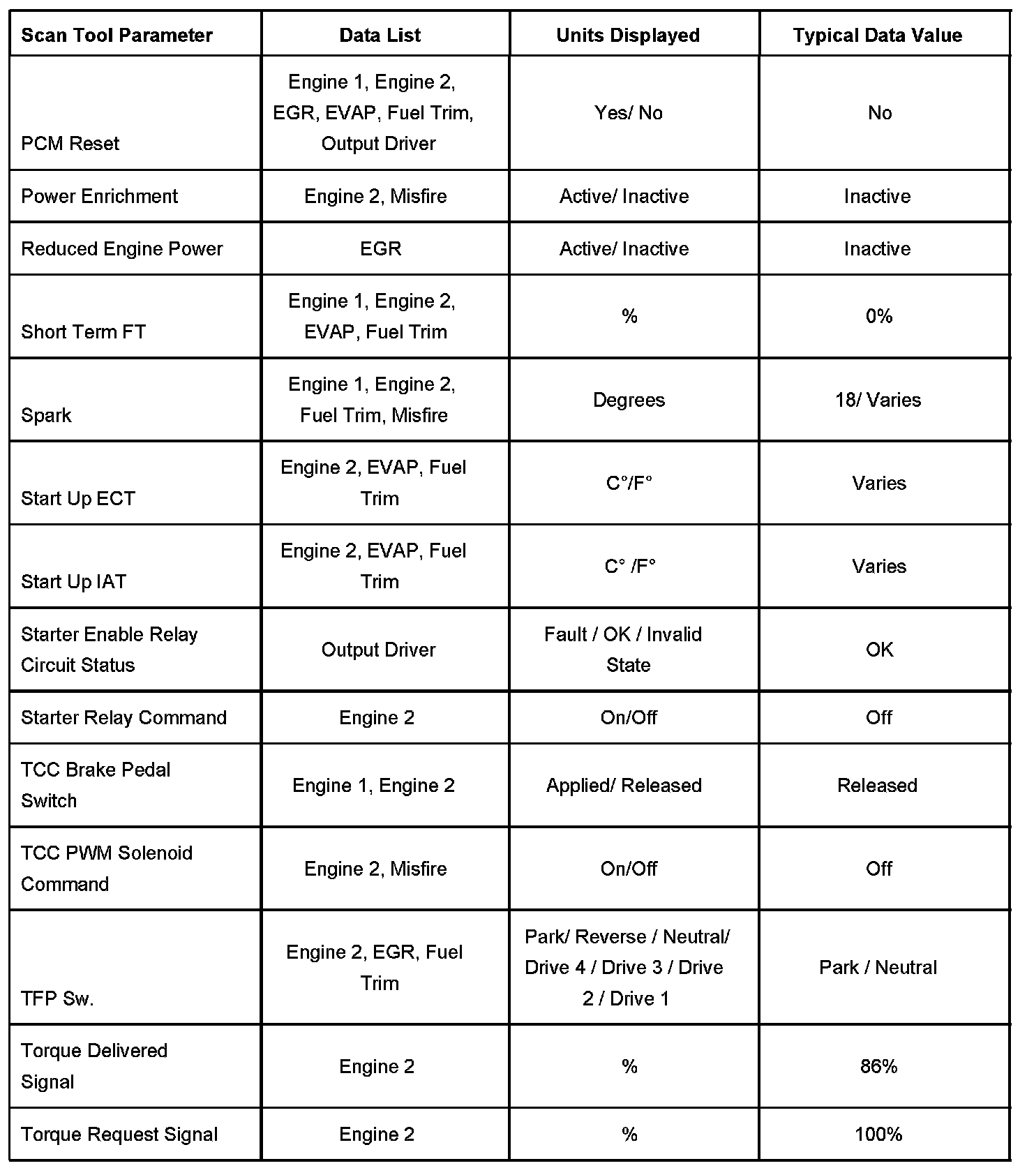 Use the Typical Scan Data Values table only after the Diagnostic System Check - Computers and Controls Systems has been completed, no DTCs were noted, and you have determined the on-board diagnostics are functioning properly. Scan tool values from a properly running engine may be used for comparison with the engine you are diagnosing. The Typical Scan Data values represent values that would be seen on a normally running engine.