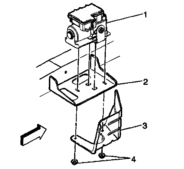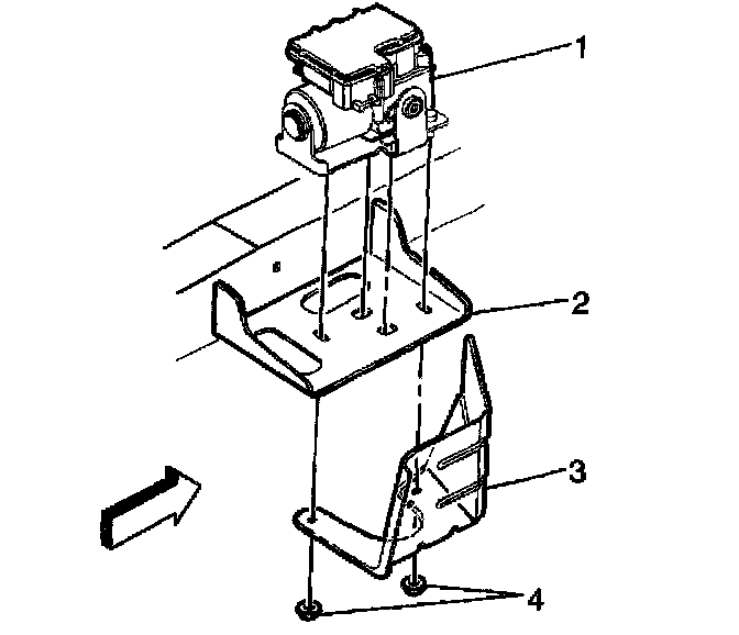 8. Secure the module (1) to the frame bracket (3) and fuel pipe shield (2) with the 2 nuts (4).