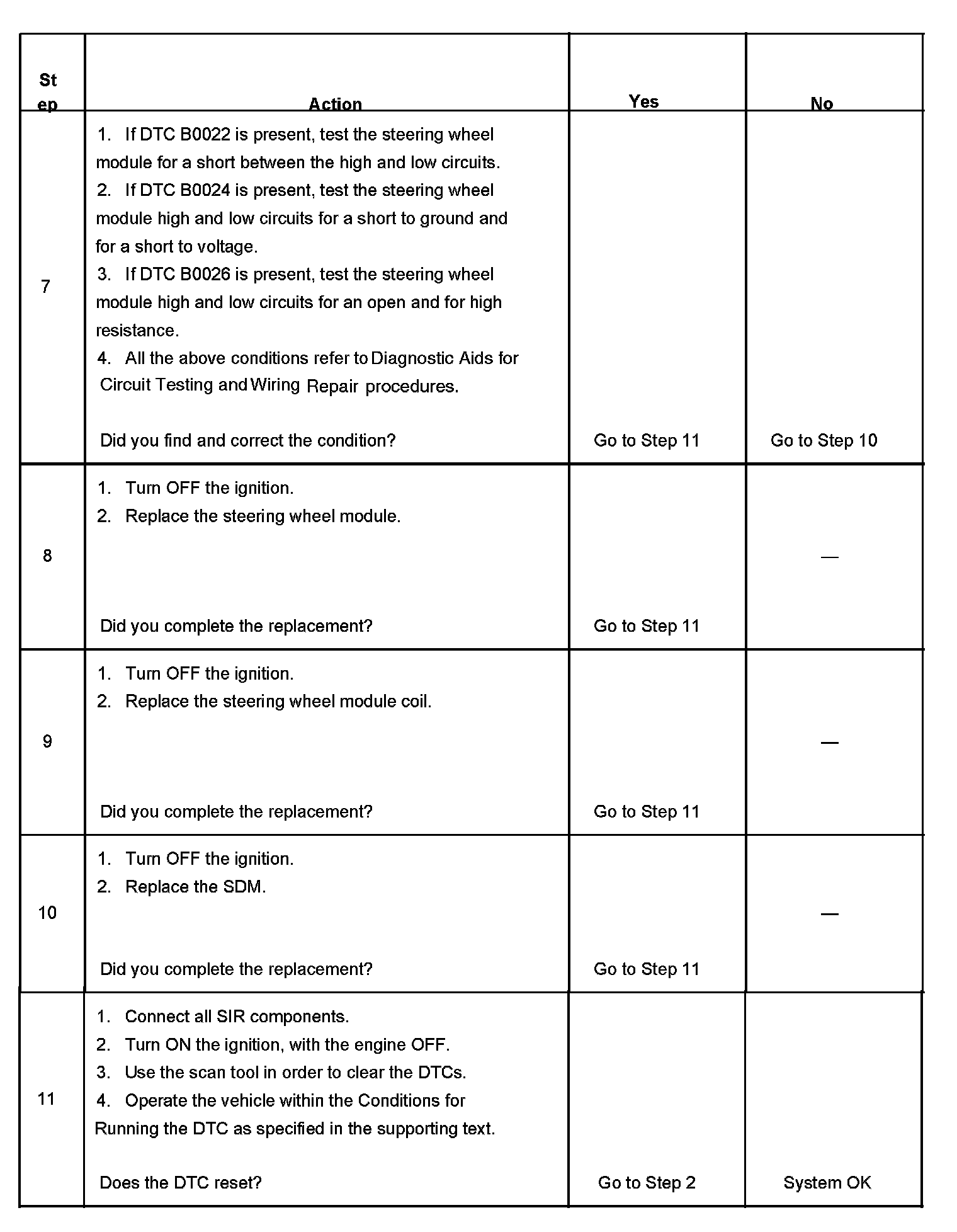 7. Tests to see what DTCs are present. If DTC B0022 is present, test the steering wheel module for a short between high and low circuits. If DTC B0024 is present, test the steering wheel module high and low circuits for an open and for high resistance. If DTC B0026 is present, test the steering wheel module high and low circuits for an open and for high resistance.
