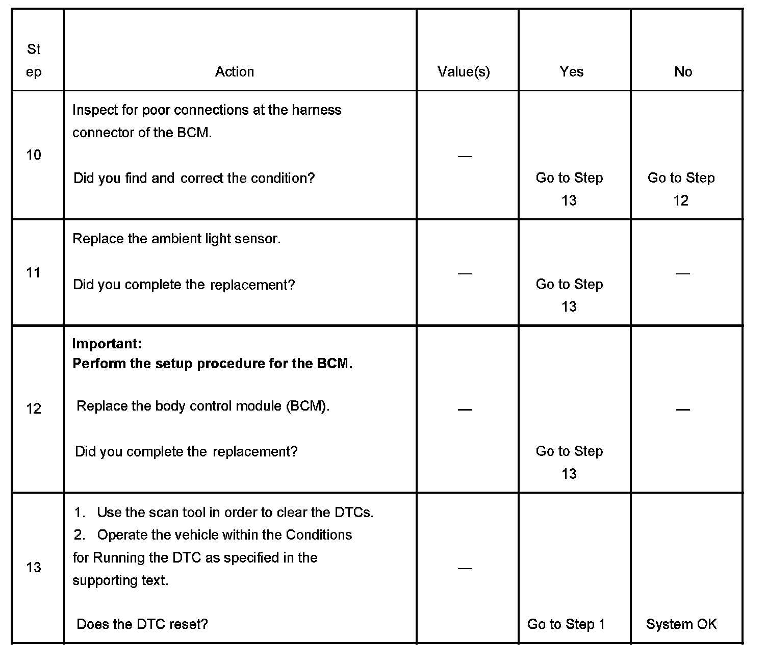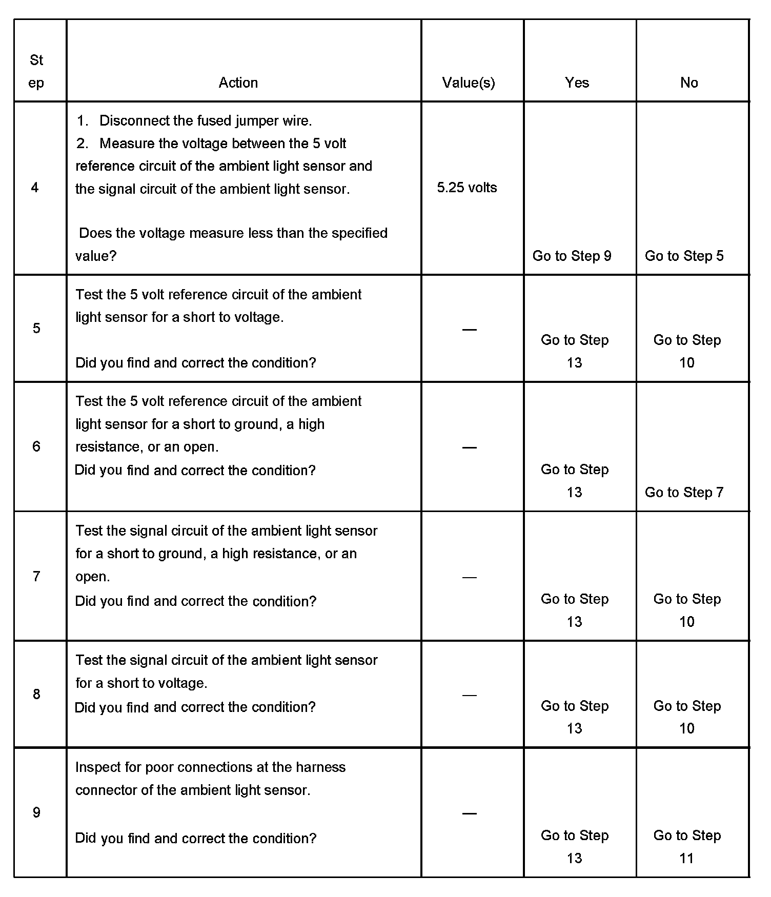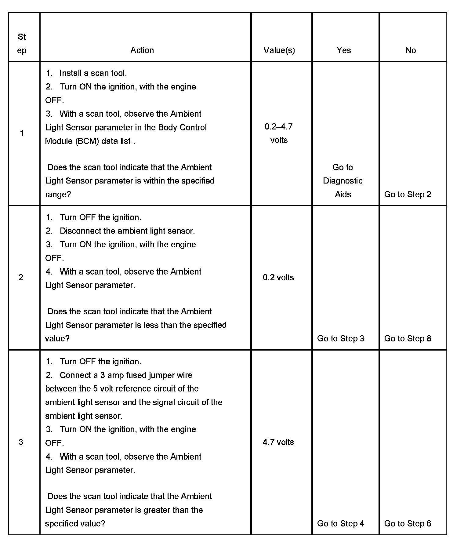 The body control module (BCM) provides a constant output reference voltage of 5 volts for the proper operation of the ambient light sensor. The constant output reference voltage supply ensures that variations in the output signal of the ambient light sensor are due to changes of the sensor rather than variations in the voltage supply. The BCM monitors the constant output reference voltage and sets a DTC when the output is not within the expected range of 4.75-5.25 volts.