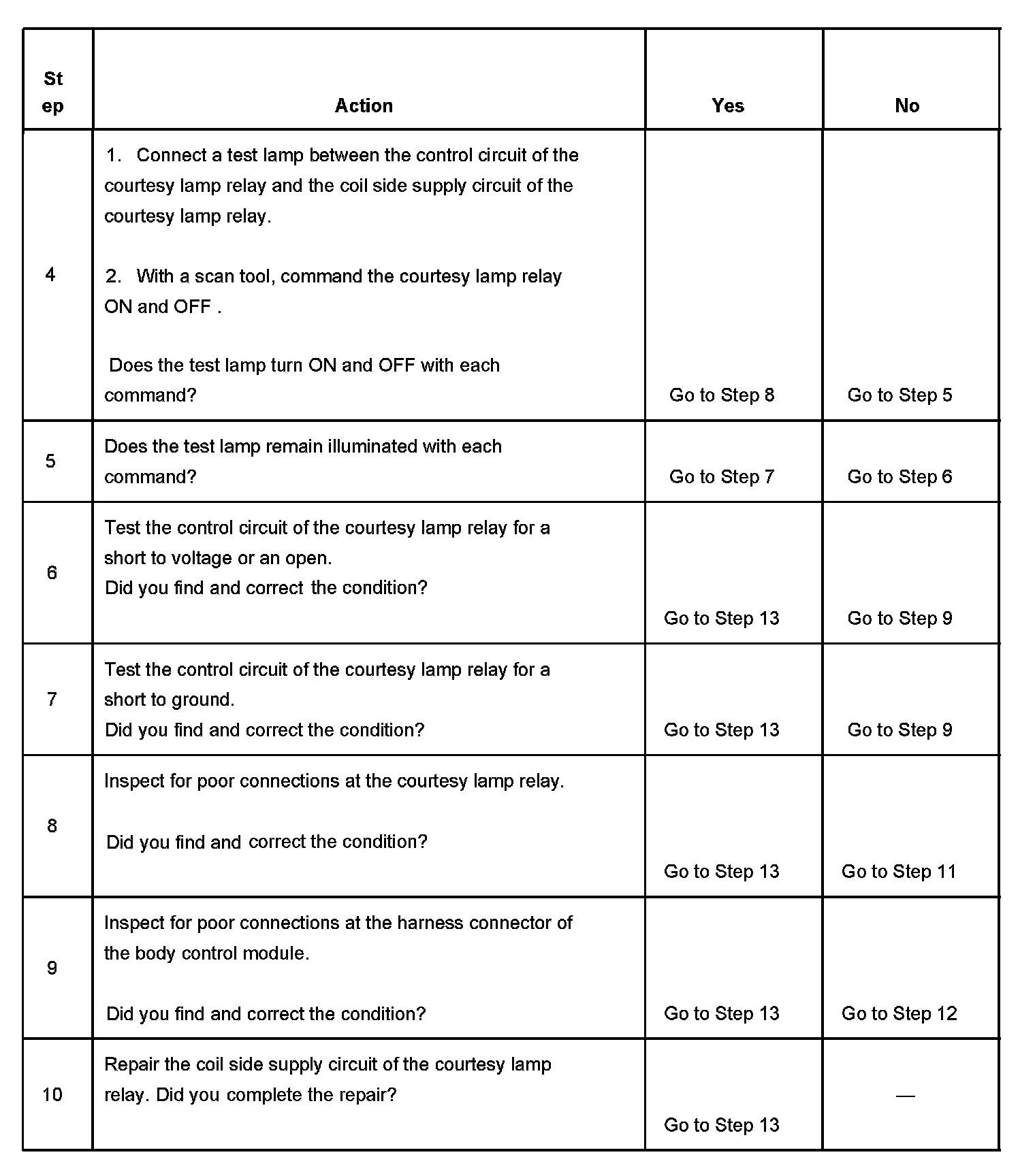 4. Verifies that the body control module is providing ground to the courtesy lamp relay.