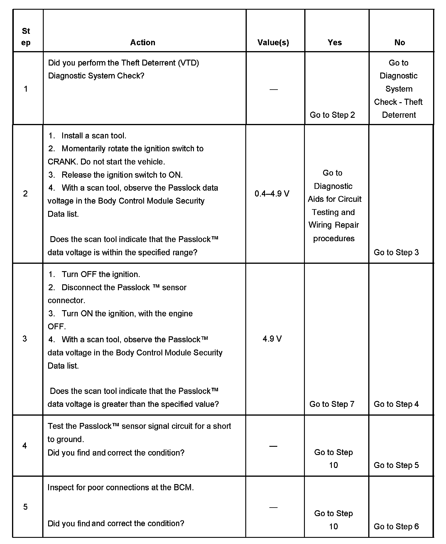 4. Tests for a short to ground in the Passlock sensor signal circuit.