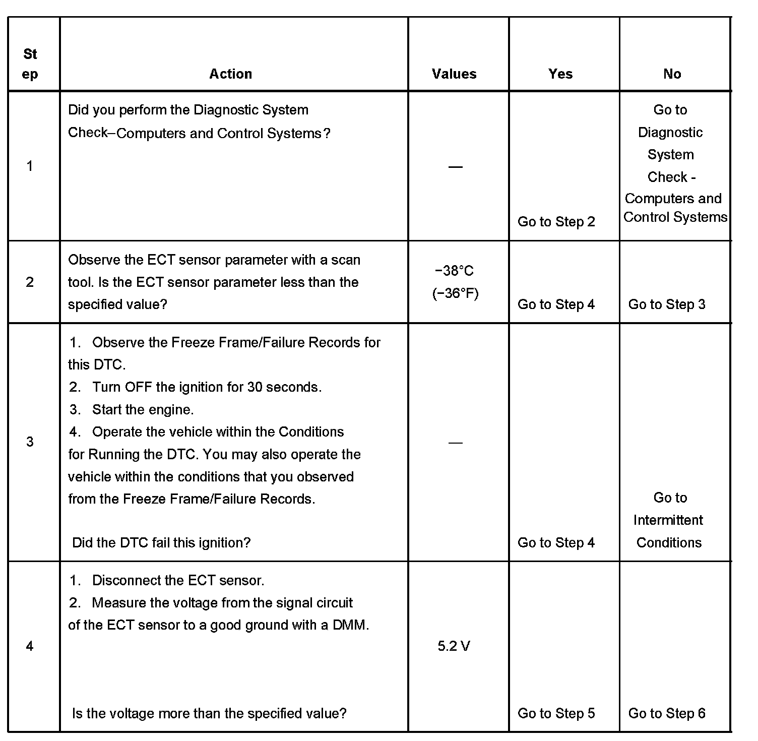 The PCM detects that the ECT sensor parameter is less than -38 °C (-36 °F) for 20 seconds.