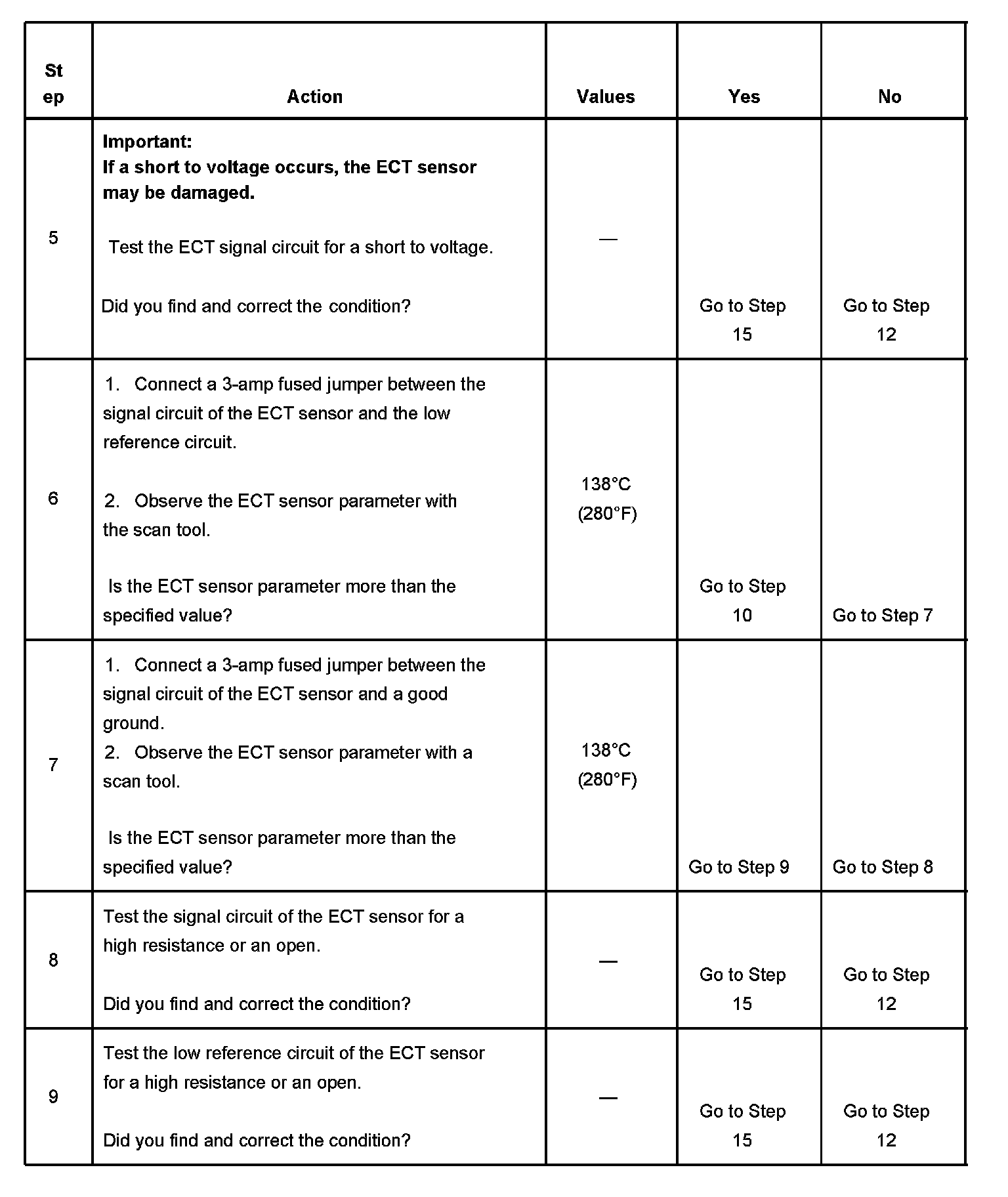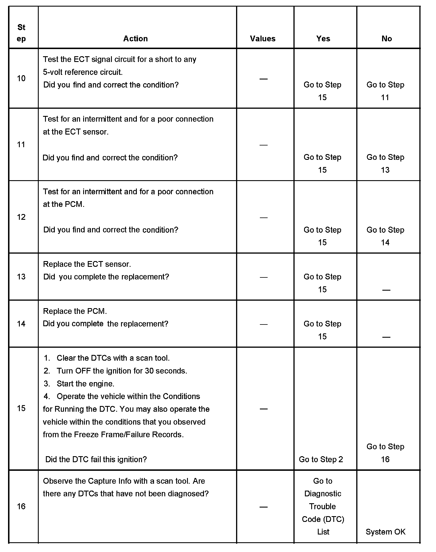 The engine coolant temperature (ECT) sensor is a variable resistor, that measures the temperature of the engine coolant. The ECT sensor has a signal circuit and a low reference circuit. The powertrain control module (PCM) supplies 5 volts to the ECT signal circuit and a ground for the ECT low reference circuit. When the ECT is cold, the sensor resistance is high. When the ECT increases, the sensor resistance decreases. With high sensor resistance, the PCM detects a high voltage on the ECT signal circuit. With lower sensor resistance, the PCM detects a lower voltage on the ECT signal circuit. If the PCM detects an excessively high ECT signal voltage, which is a low temperature indication, DTC P0118 sets.