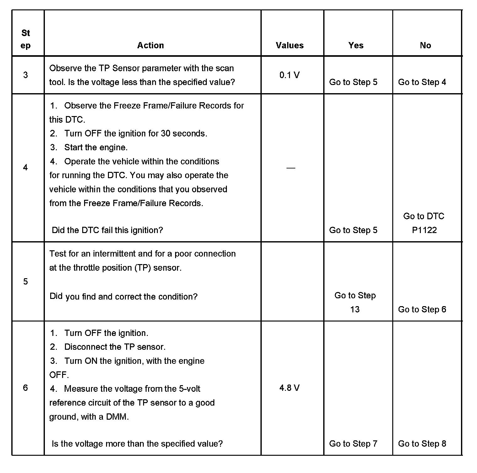 The PCM provides the TP sensor with 5 volts on the 5-volt reference circuit and a ground on the low reference circuit. Rotation of the TP sensor rotor from the closed throttle position to the wide open throttle (WOT) position provides the PCM with a signal voltage from less than 1 volt to more than 4 volts through the TP sensor signal circuit. If the PCM detects an excessively low signal voltage, DTC P0122 sets.