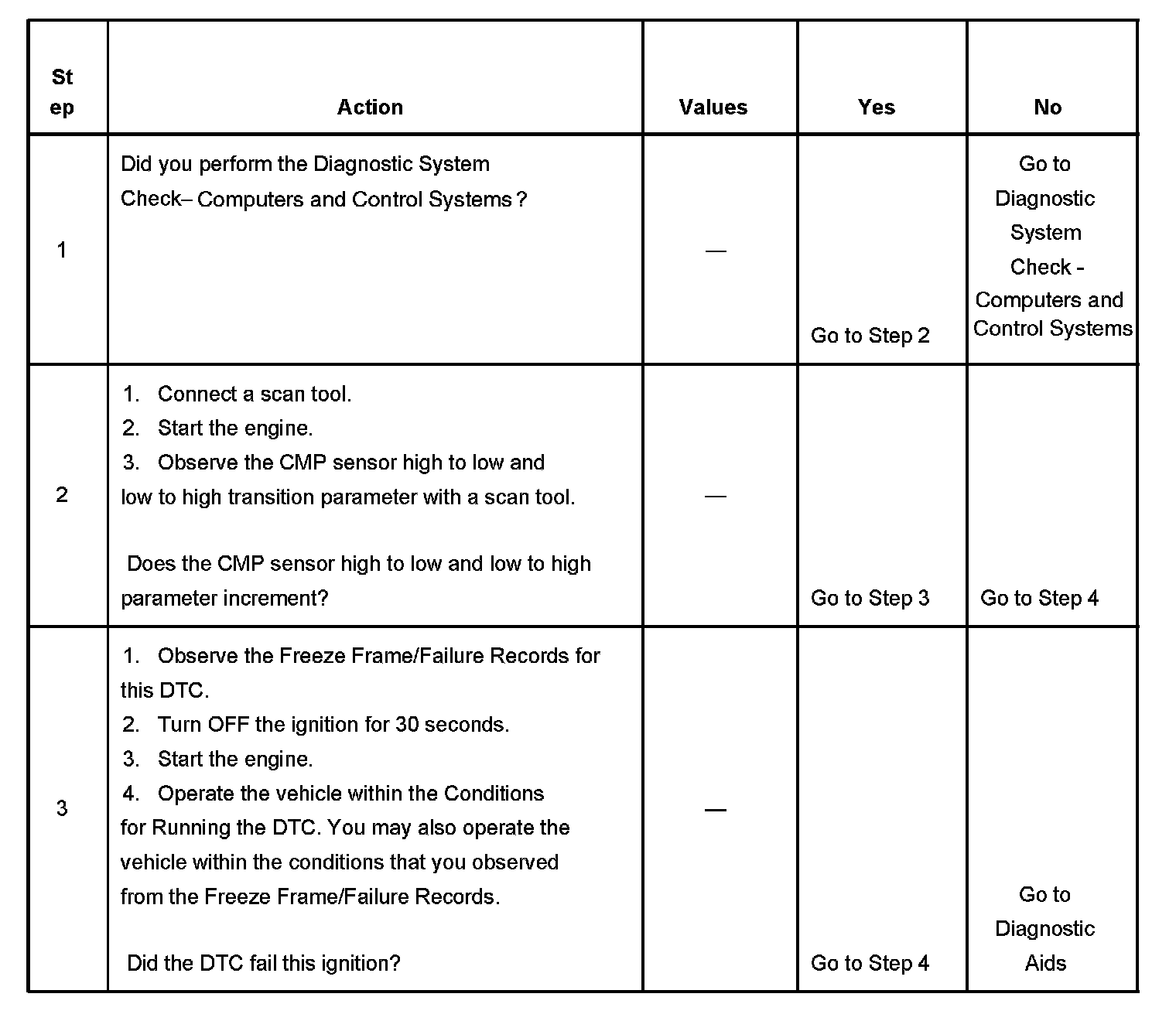 The CMP sensor reference pulse is not detected once every 2 crankshaft revolutions.