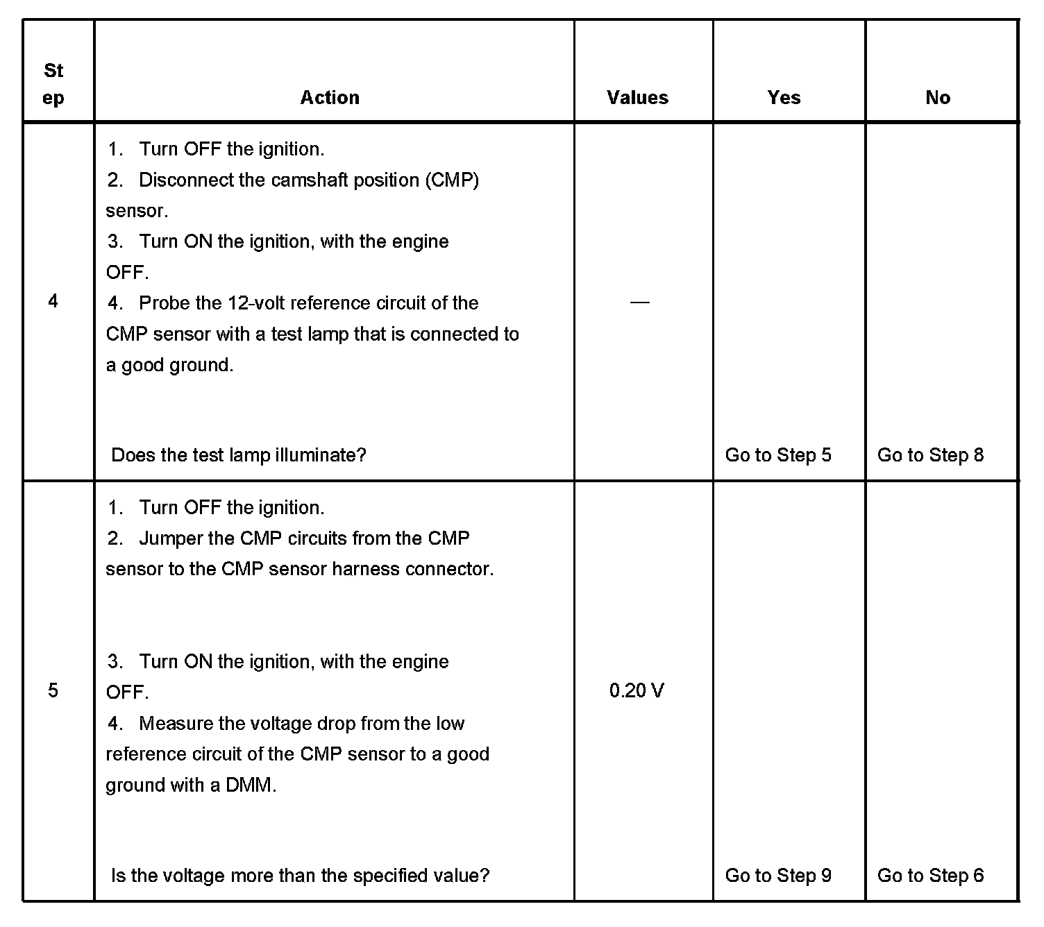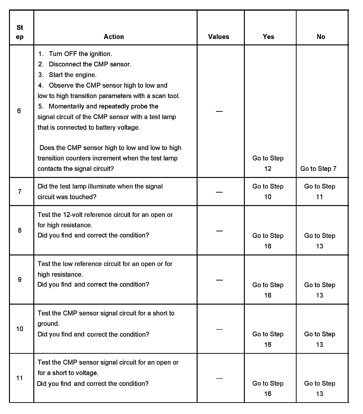 6. This step tests the CMP sensor signal circuit. Applying a voltage causes the CMP sensor high to low and low to high parameter to increase if the circuit and the PCM are operating properly.