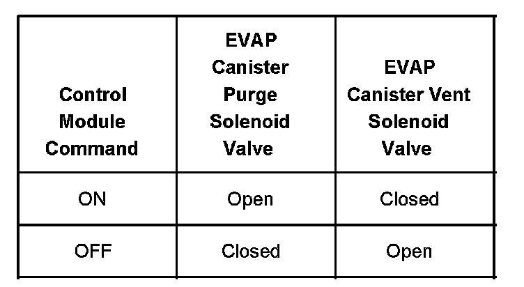 The table illustrates the relationship between the ON and OFF states, and the Open or Closed states of the EVAP canister purge and vent solenoid valves.