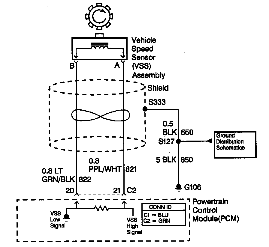 The Vehicle Speed Sensor (VSS) assembly provides vehicle speed information to the Powertrain Control Module (PCM). The VSS assembly is a permanent magnet generator. The VSS produces an AC voltage as rotor teeth on the transmission output shaft pass through the sensor's magnetic field. The AC voltage level and the number of pulses increase as the speed of the vehicle increases. The PCM converts the pulsing voltage to vehicle speed. The PCM uses the vehicle speed signal to determine shift timing and Torque Converter Clutch (TCC) scheduling.