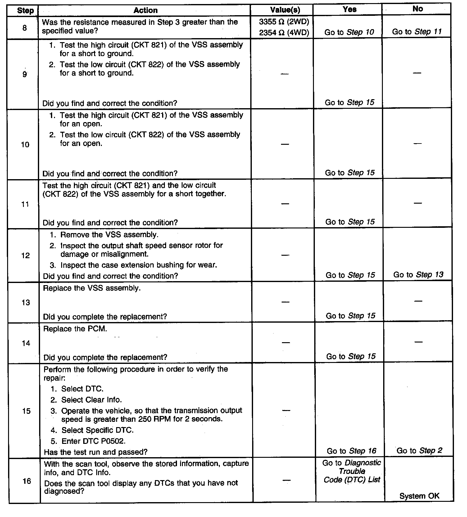 When the PCM detects a low vehicle speed when there is a high engine speed in a drive gear range, then DTC P0502 sets. DTC P0502 is a type B DTC.