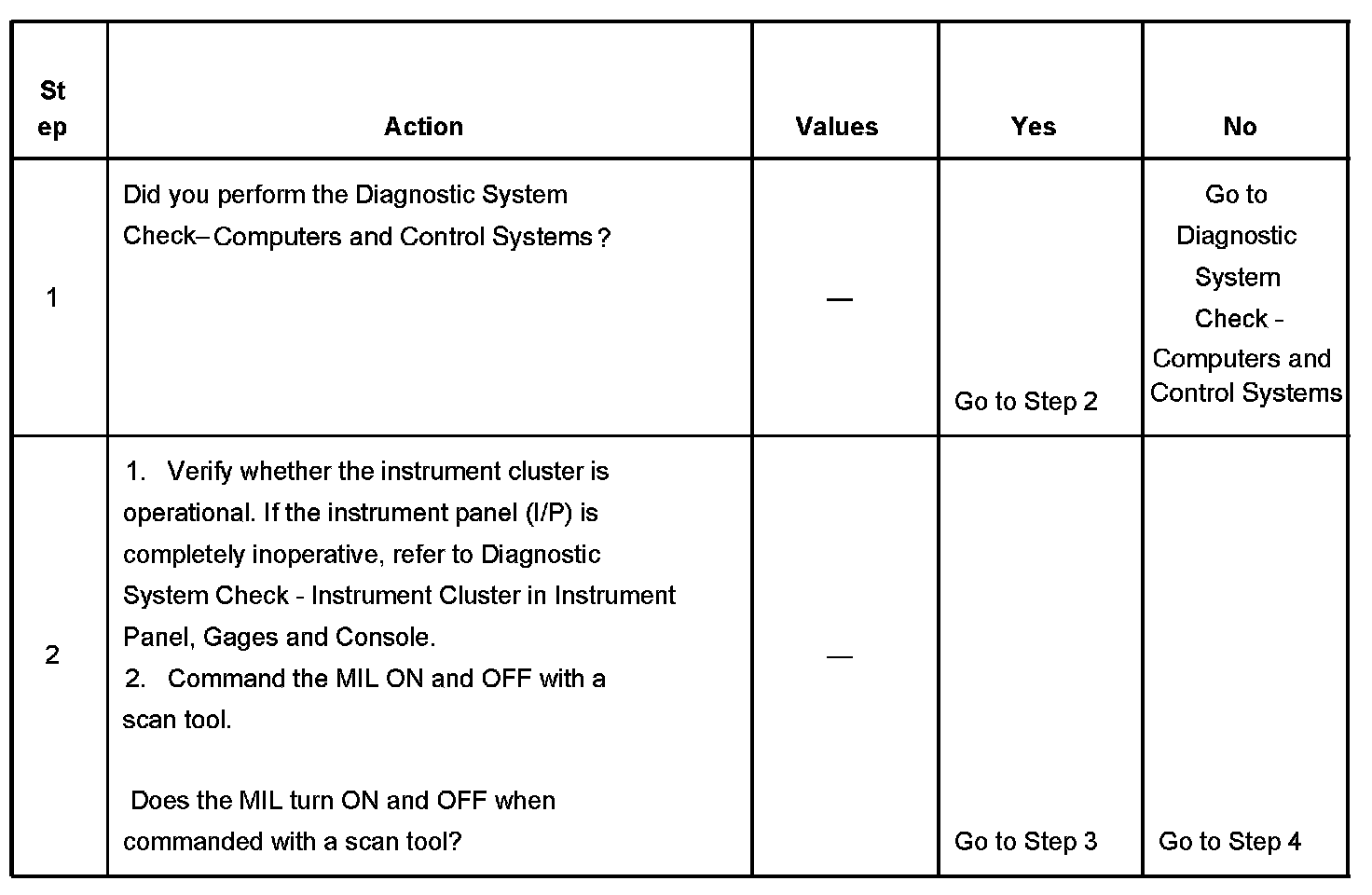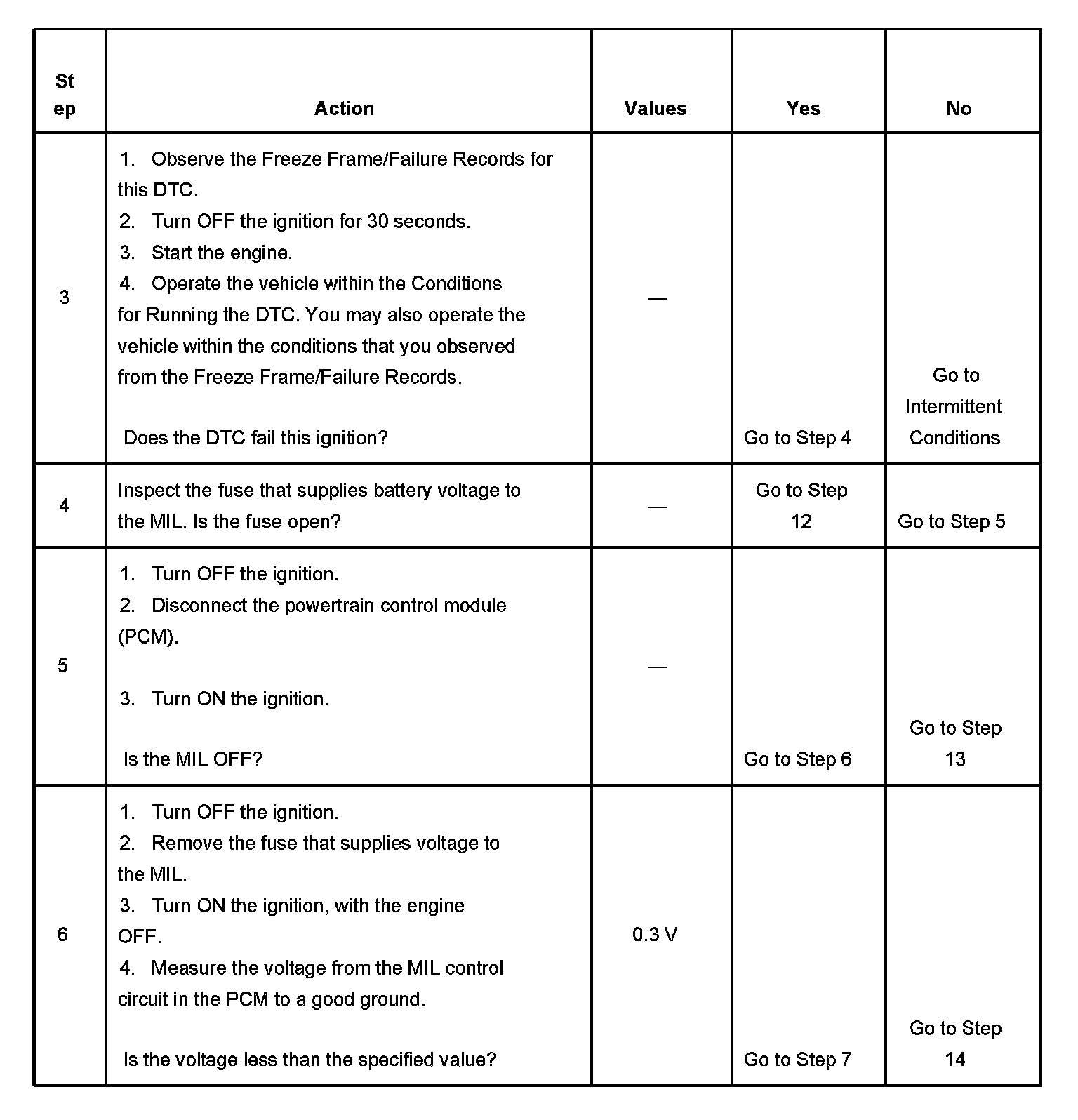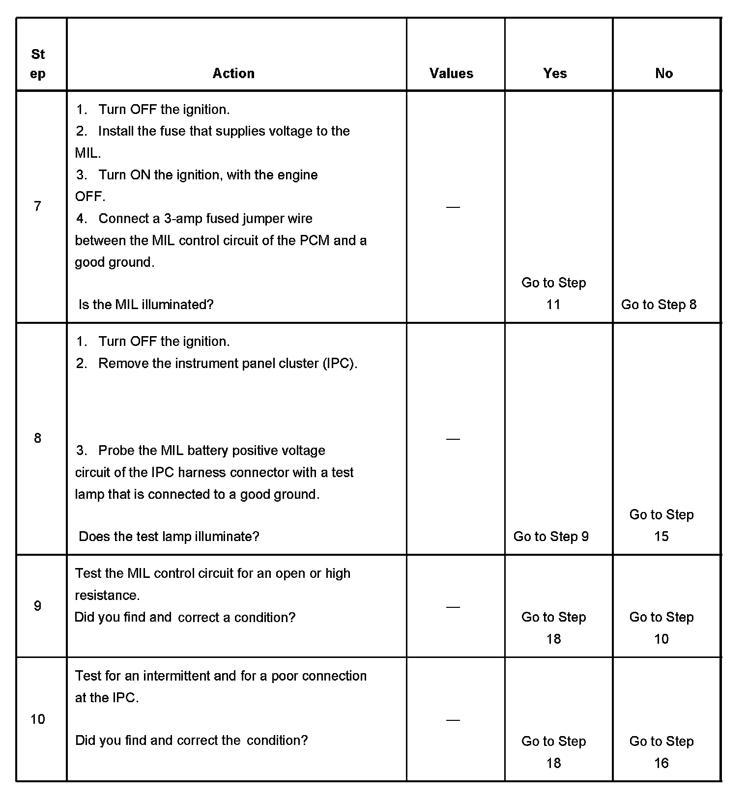 5. This step tests for a short to ground in the MIL control circuit. With the powertrain control module (PCM) disconnected and the ignition ON, the MIL should be OFF.