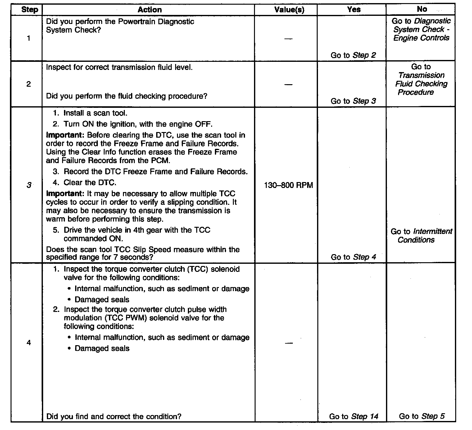 If Condition 1 is met and the TCC slip speed is 130-800 RPM for 7 seconds, then the PCM will command the TCC Off for 1.5 seconds.