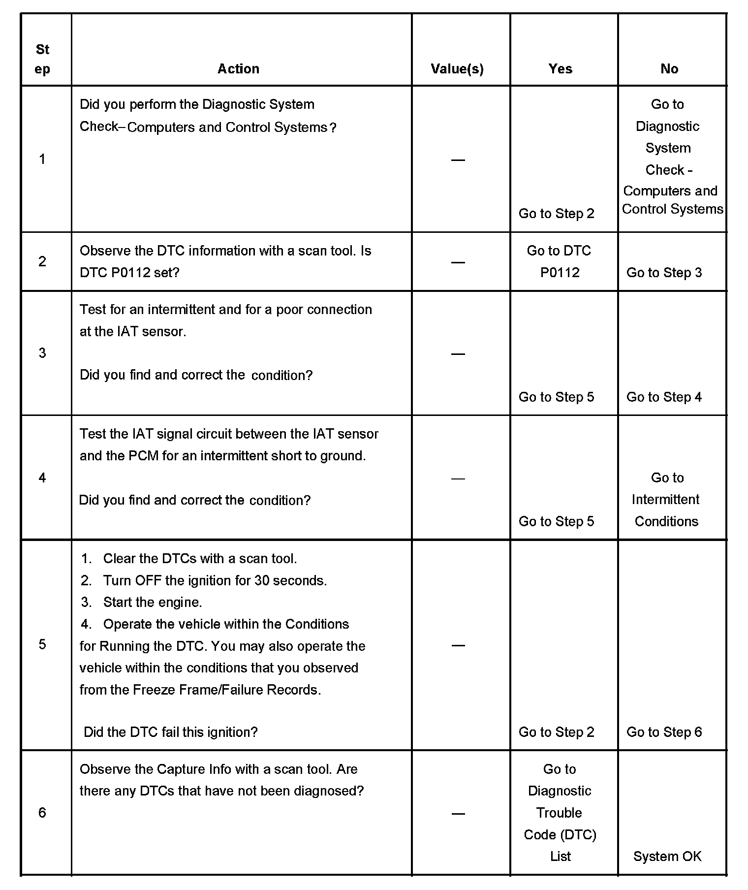 The intake air temperature (IAT) sensor is a variable resistor. The IAT sensor has a signal circuit and a low reference circuit. The IAT sensor measures the temperature of the air entering the engine. The powertrain control module (PCM) supplies 5 volts to the IAT signal circuit and a ground for the IAT low reference circuit. When the IAT sensor is cold, the sensor resistance is high. When the air temperature increases, the sensor resistance decreases. With high sensor resistance, the PCM detects a high voltage on the IAT signal circuit. With lower sensor resistance, the PCM detects a lower voltage on the IAT signal circuit. If the PCM detects an intermittent low IAT signal voltage, indicating a high temperature, DTC P1112 sets.