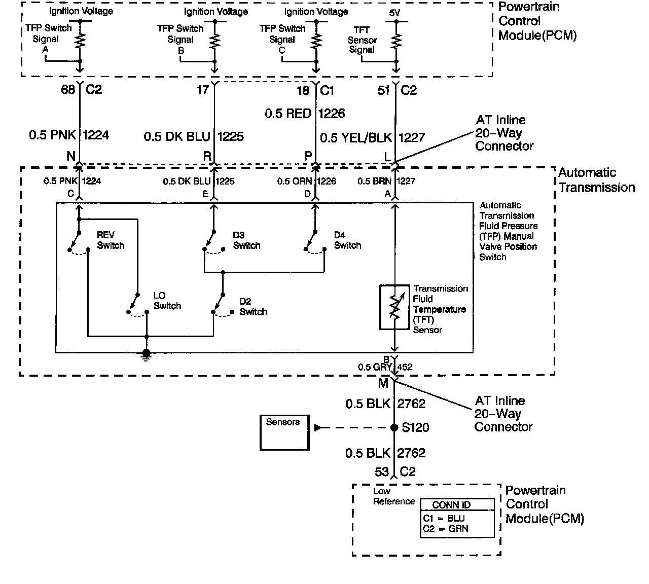 The TFP manual valve position switch cannot distinguish between PARK and NEUTRAL because the monitored valve body pressures are identical. With the engine OFF and the ignition switch in the ON position, the TFP manual valve position switch indicates PARK/NEUTRAL. Disconnecting the AT inline 20-way connector removes the ground potential for the three range signals to the PCM. In this case, with the engine OFF, and the ignition switch in the ON position, D2 will be indicated.