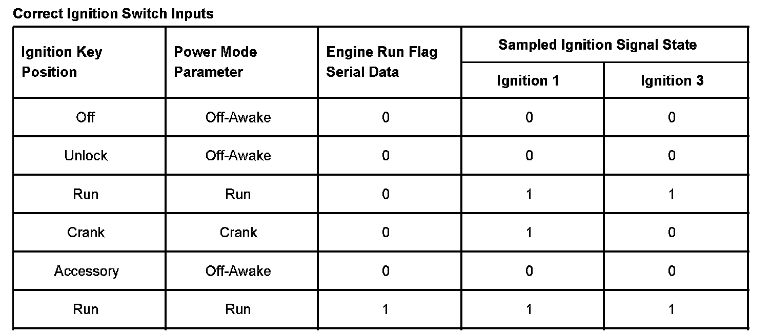 Those modules that have discrete ignition signal inputs also remain in the state dictated by the last valid BCM message received on the serial data circuits.They then check the state of their discrete ignition input to determine the current valid state. If the discrete ignition input is active, B+, the modules will fail-safe to the "RUN" power mode. If the discrete ignition input is not active, open or 0 voltage, the modules will fail-safe to "OFF-AWAKE". In this state the modules are constantly checking for a change status message on the serial data circuits and can respond to both local inputs and serial data inputs from other modules on the vehicle.