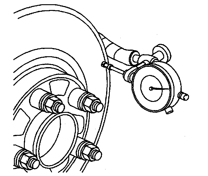 10. Mount a dial indicator, J45101, or equivalent, to the steering knuckle and position the indicator button so it contacts the brake rotor friction surface at a 90 degree angle, approximately 13 mm (0.5 inch) from the outer edge of the rotor.