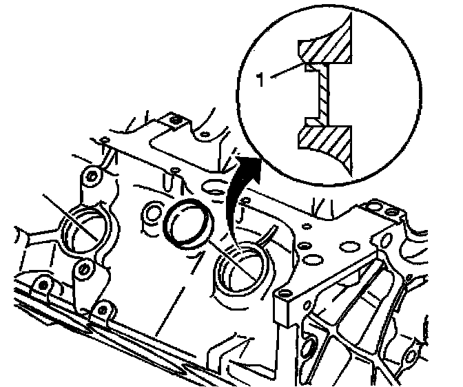 A properly installed engine block core hole plug must be installed flush or below the bottom of the chamfer (1) of the engine block core hole.