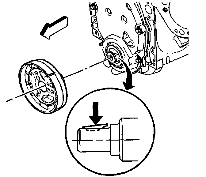 2. Apply a small amount of adhesive GM P/N 12346141 (Canadian P/N 10953433) or equivalent, onto the crankshaft balancer keyway in order to seal the crankshaft balancer keyway and crankshaft joint.